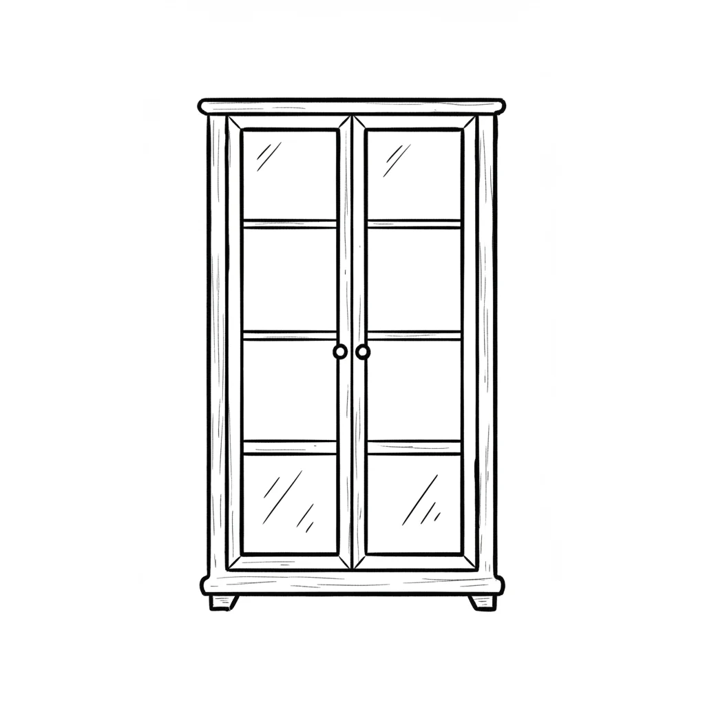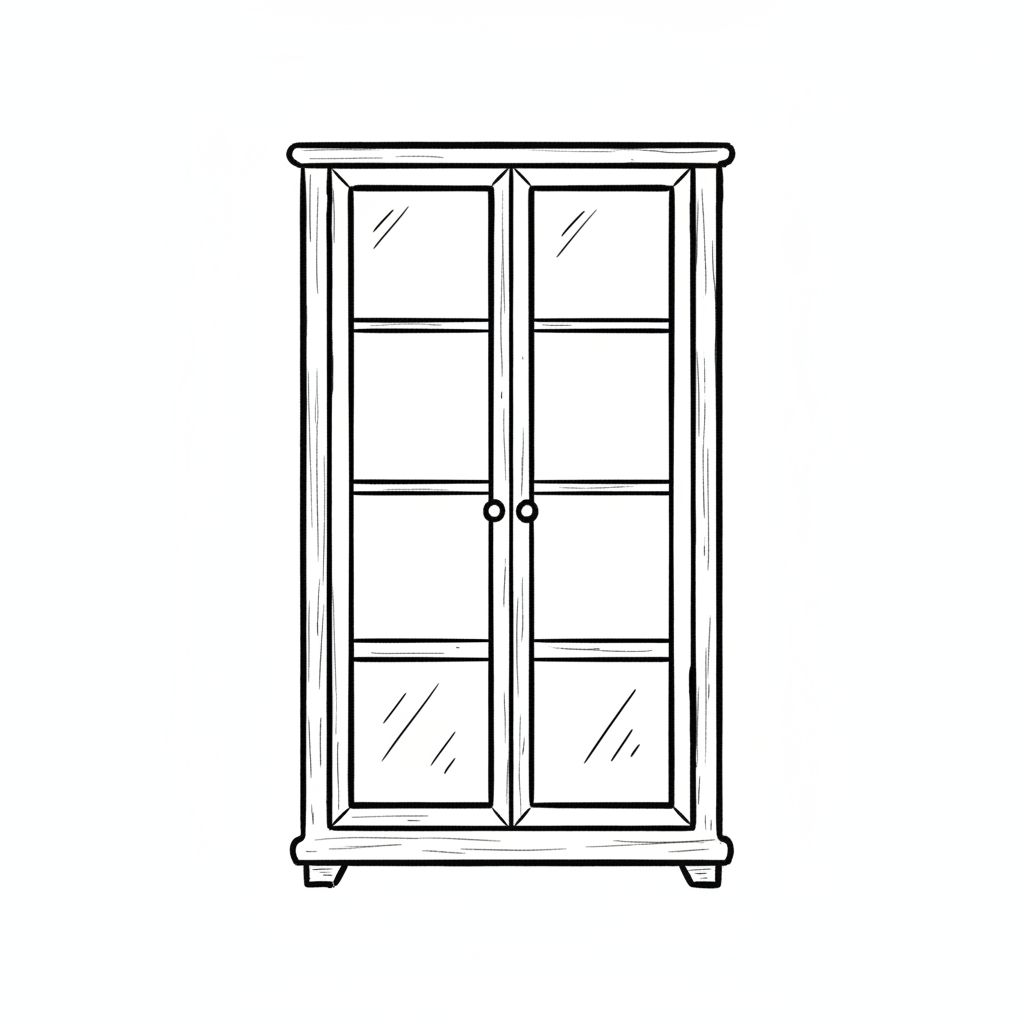 Schwarz-weiß-Skizze eines Vitrinenschranks mit Glastüren und Regalböden.