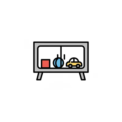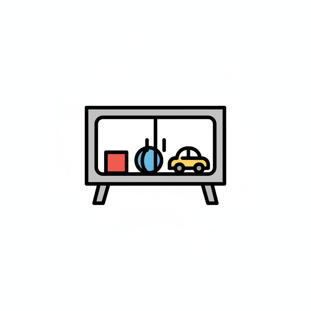 Buntes Spielzeug (Würfel, Ball, Auto) in einem grauen Schrank.