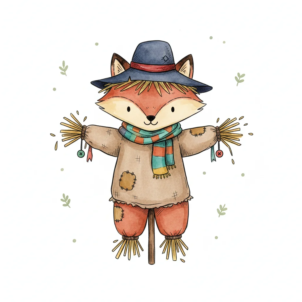 Niedlicher, cartoonhafter Fuchs als Scheunenbewohner mit Hut und Schal.