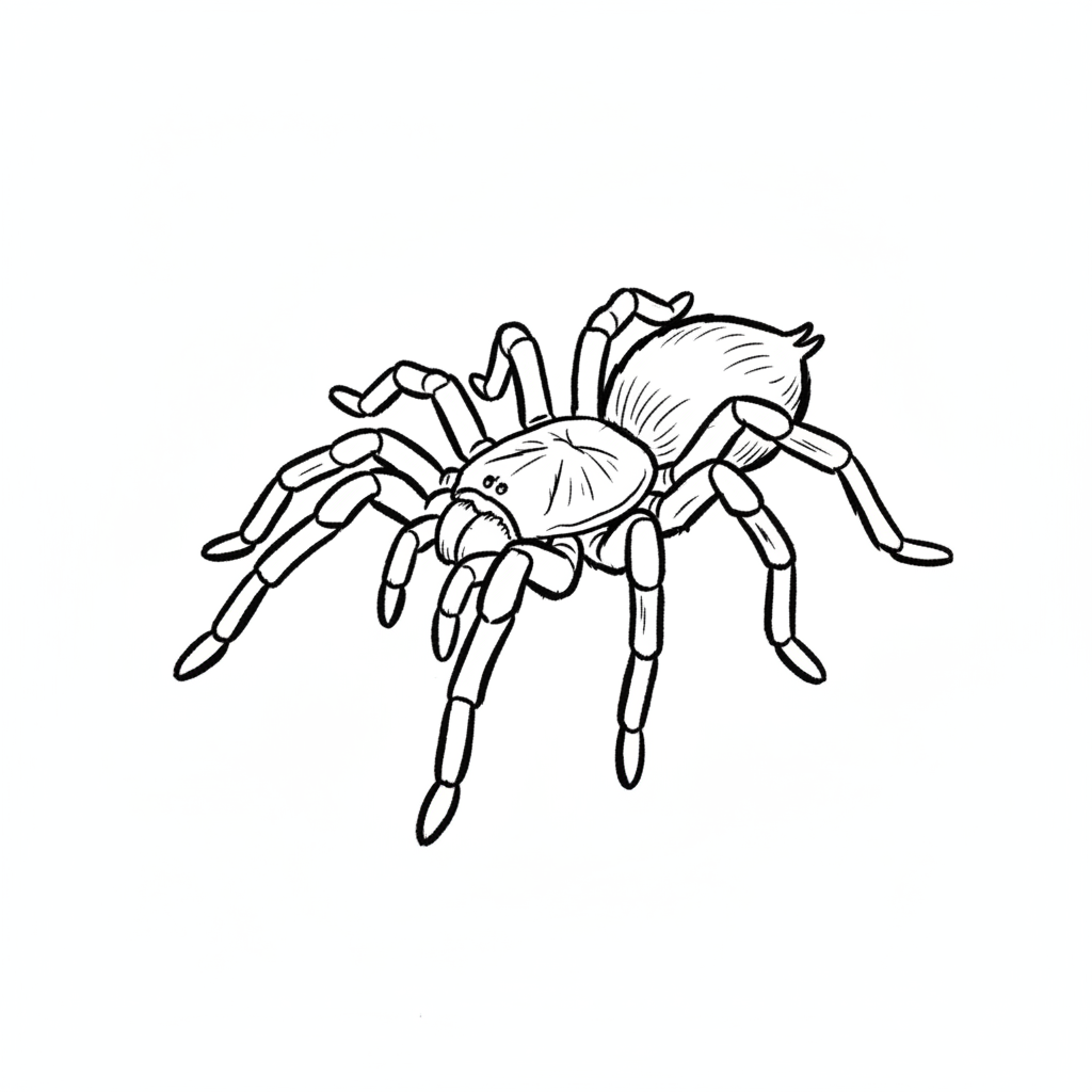Eine cartoonhafte Darstellung einer braunen Spinne aus der Vogelspinnenfamilie.