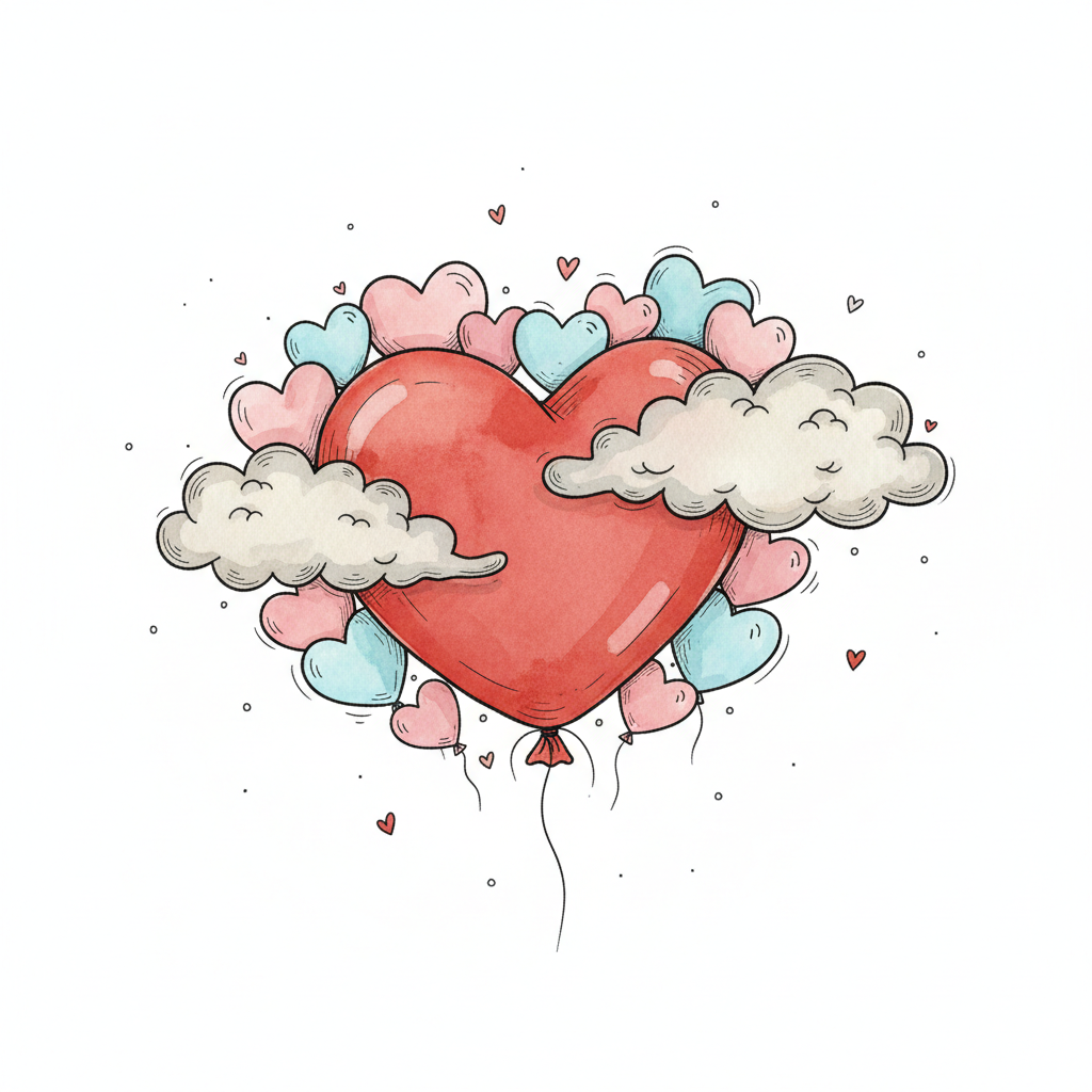 Liebevolle Aquarell-Illustration: Roter Herzballon umgeben von kleinen Herzen und Wolken.