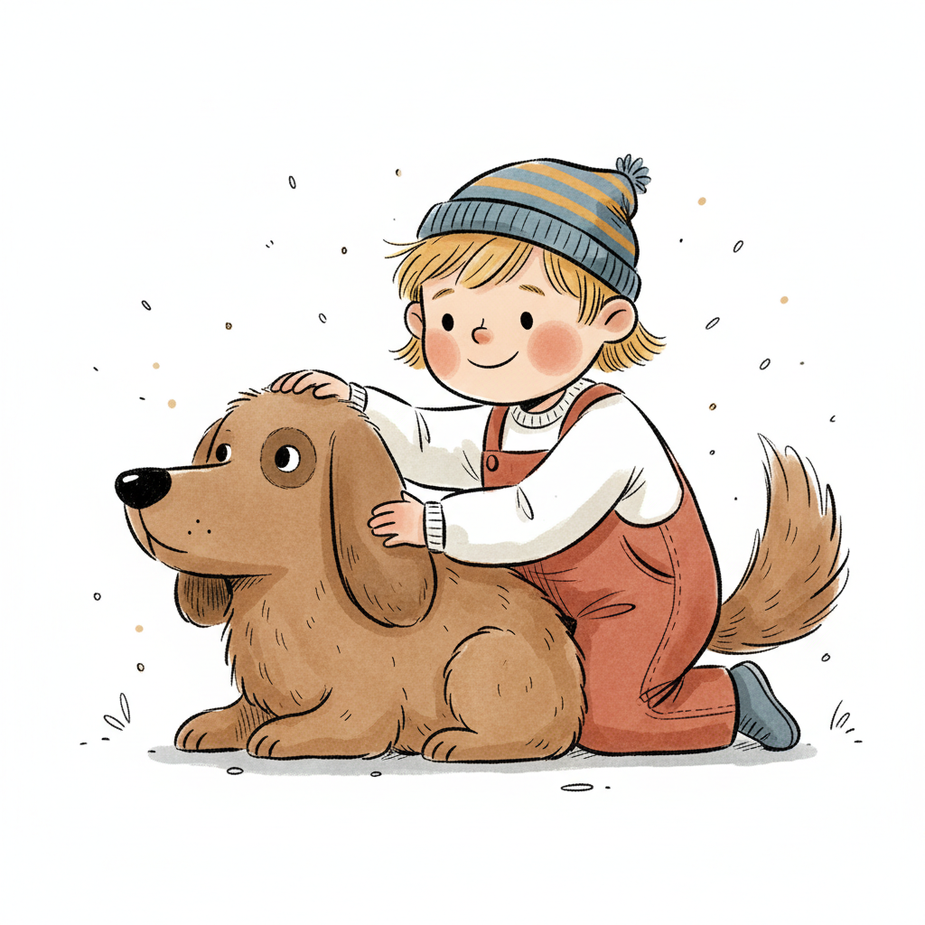 Niedliches Cartoon-Kind mit Mütze streichelt liebevoll einen braunen Hund.
