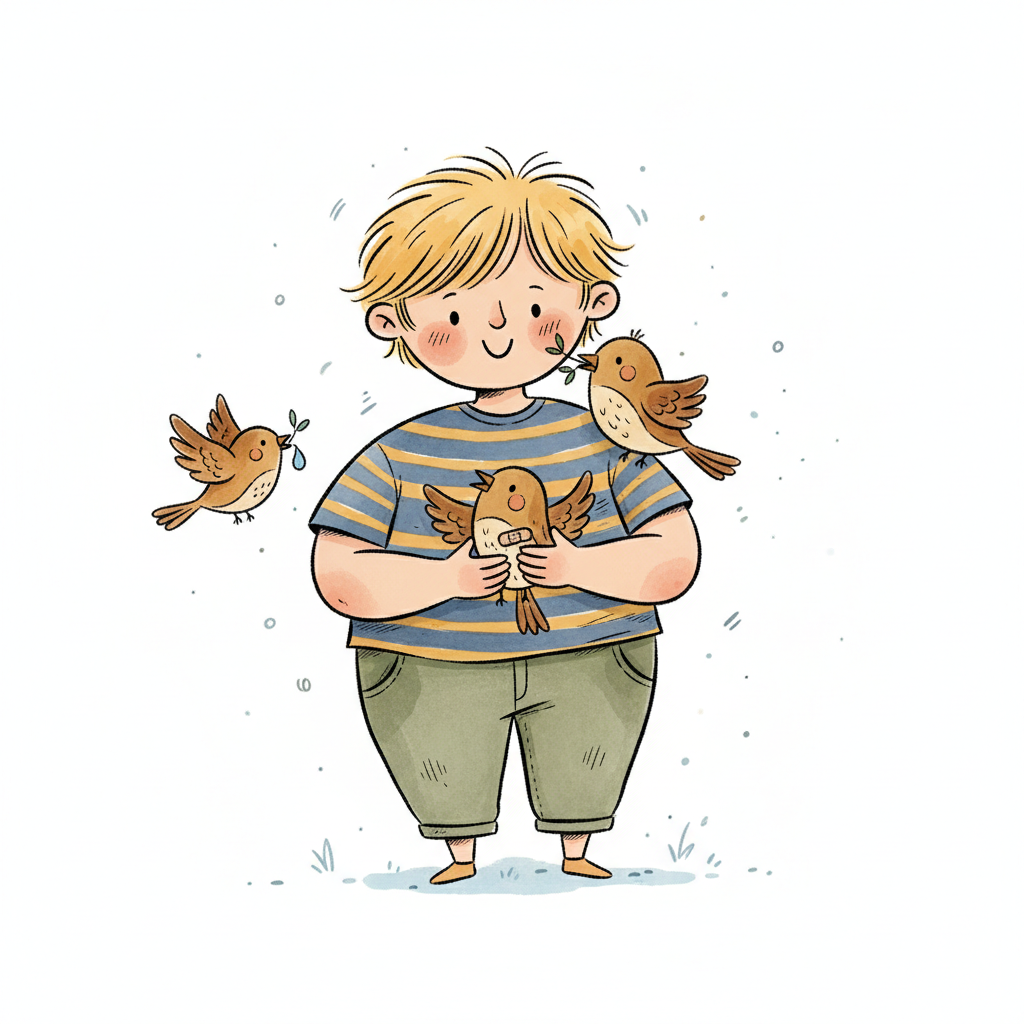 Ein Junge kümmert sich liebevoll um Vögel; er hält einen verletzten, andere fliegen um ihn.