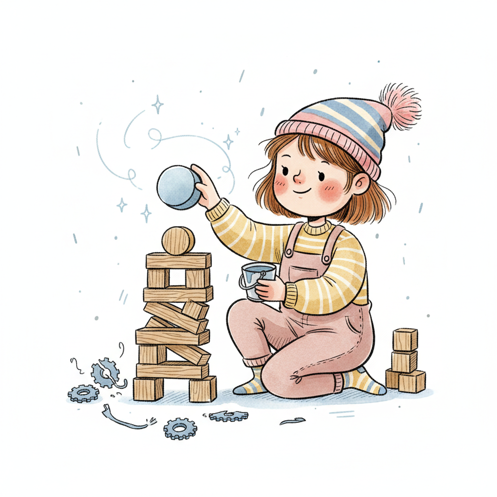 Fröhliches Mädchen mit Mütze baut einen hohen Turm aus Holzklötzen und spielt fantasievoll.