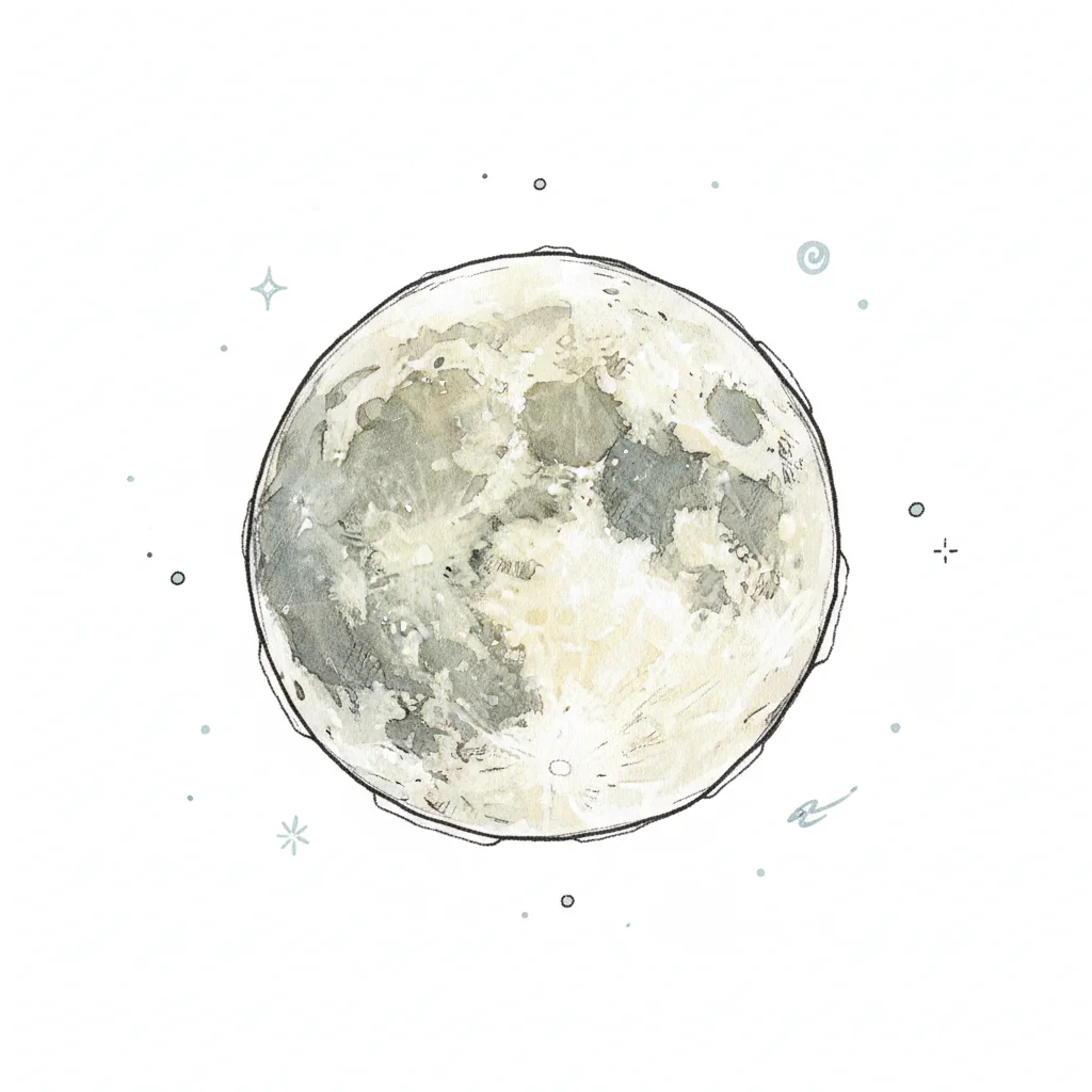 Aquarellzeichnung eines Vollmonds mit Kratern auf weißem Hintergrund, umgeben von kleinen Sternen.