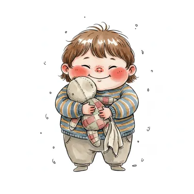 Niedliches, lächelndes Kind umarmt liebevoll ein Stofftier. Aquarell-Illustration.