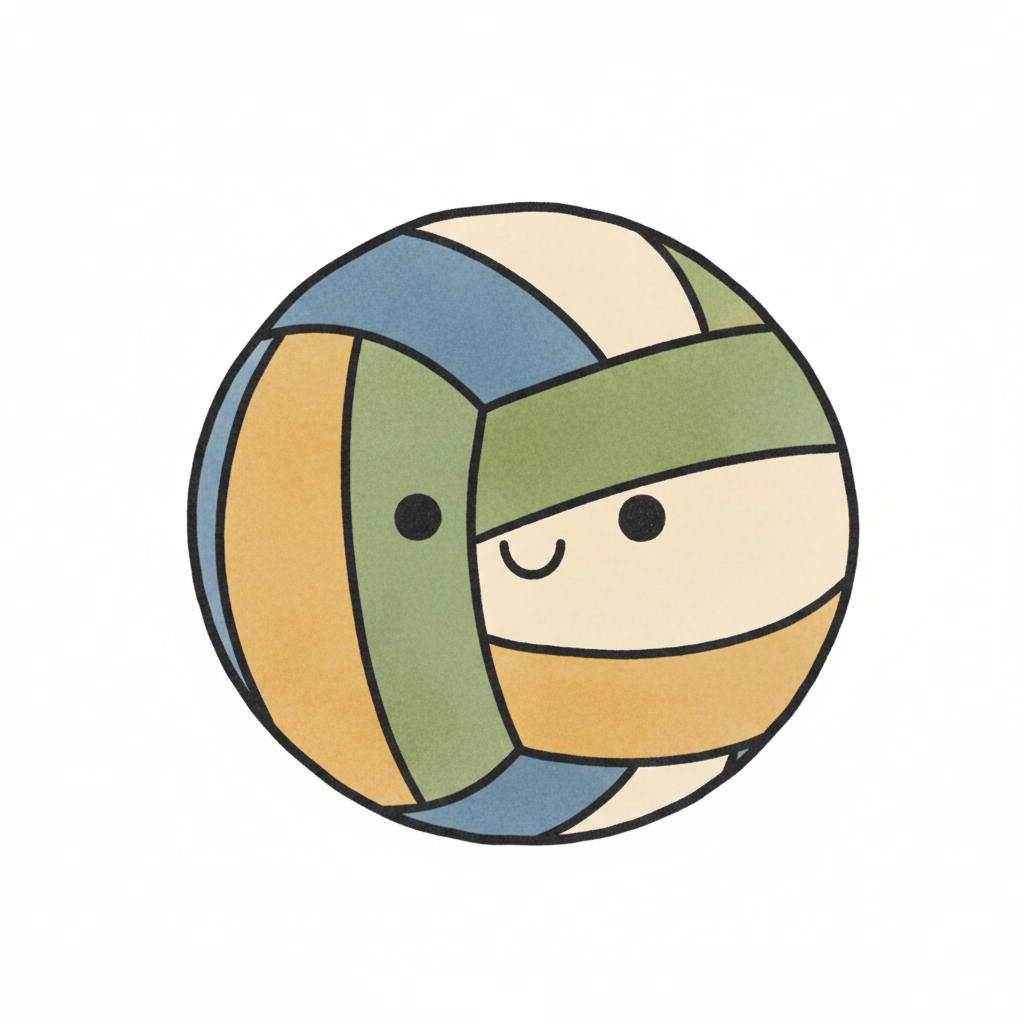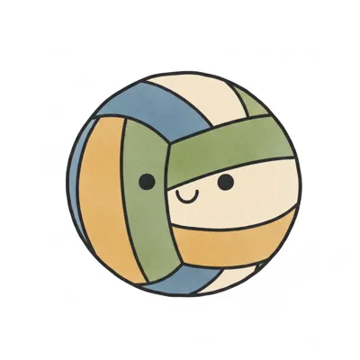 Niedlicher Cartoon-Volleyball mit freundlichem Gesicht in Pastellfarben auf weißem Hintergrund.