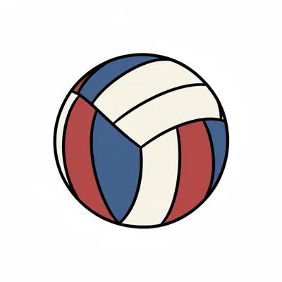 Illustration eines Volleyballs mit roten, blauen und cremefarbenen Segmenten auf weißem Hintergrund.