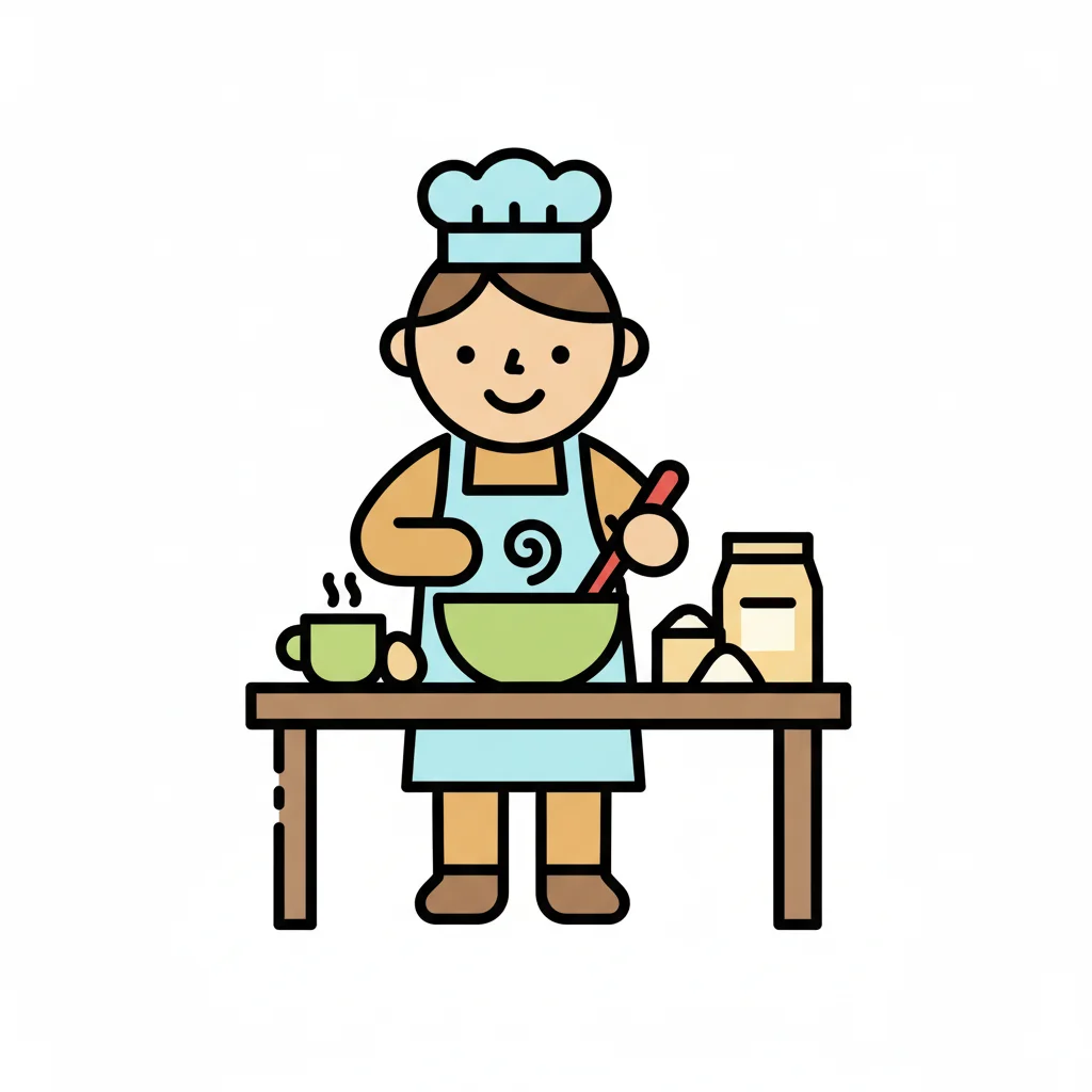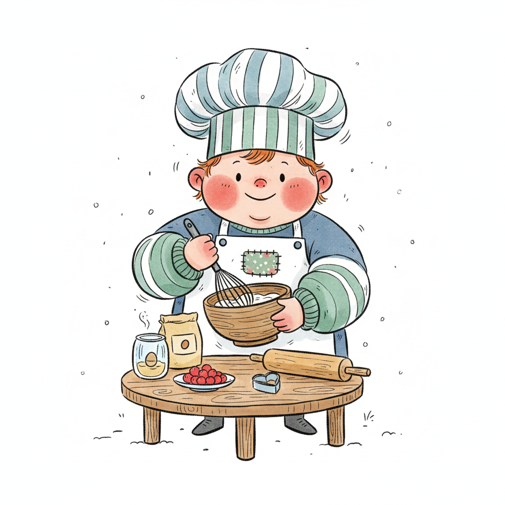 Ein niedliches Cartoon-Kind als Koch rührt Teig in einer Schüssel, umgeben von Backzutaten.