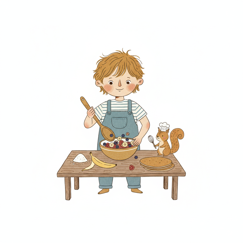 Ein Cartoon-Junge mischt Obst in einer Schüssel, während ein Eichhörnchen mit Kochmütze daneben steht.