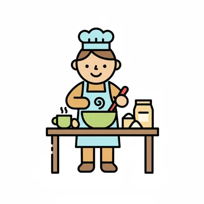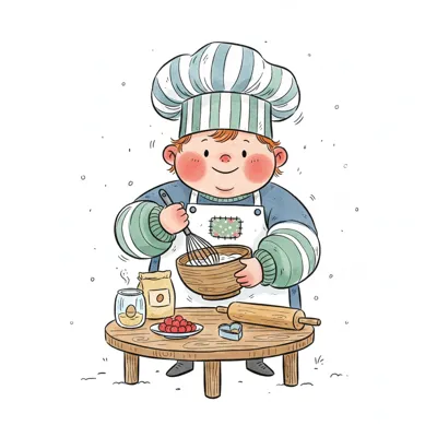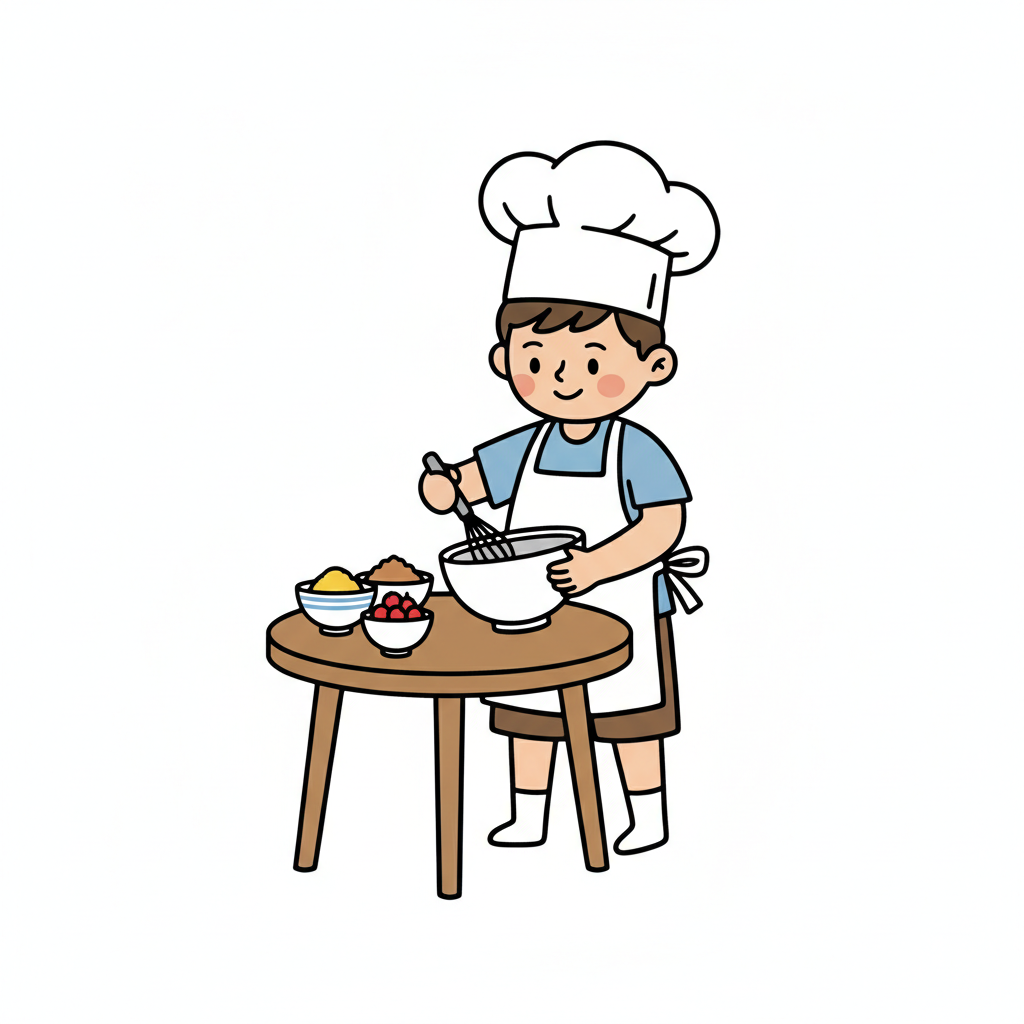 Ein Cartoon-Junge mit Kochmütze und Schürze rührt Zutaten in einer Schüssel auf einem Tisch.
