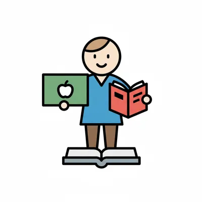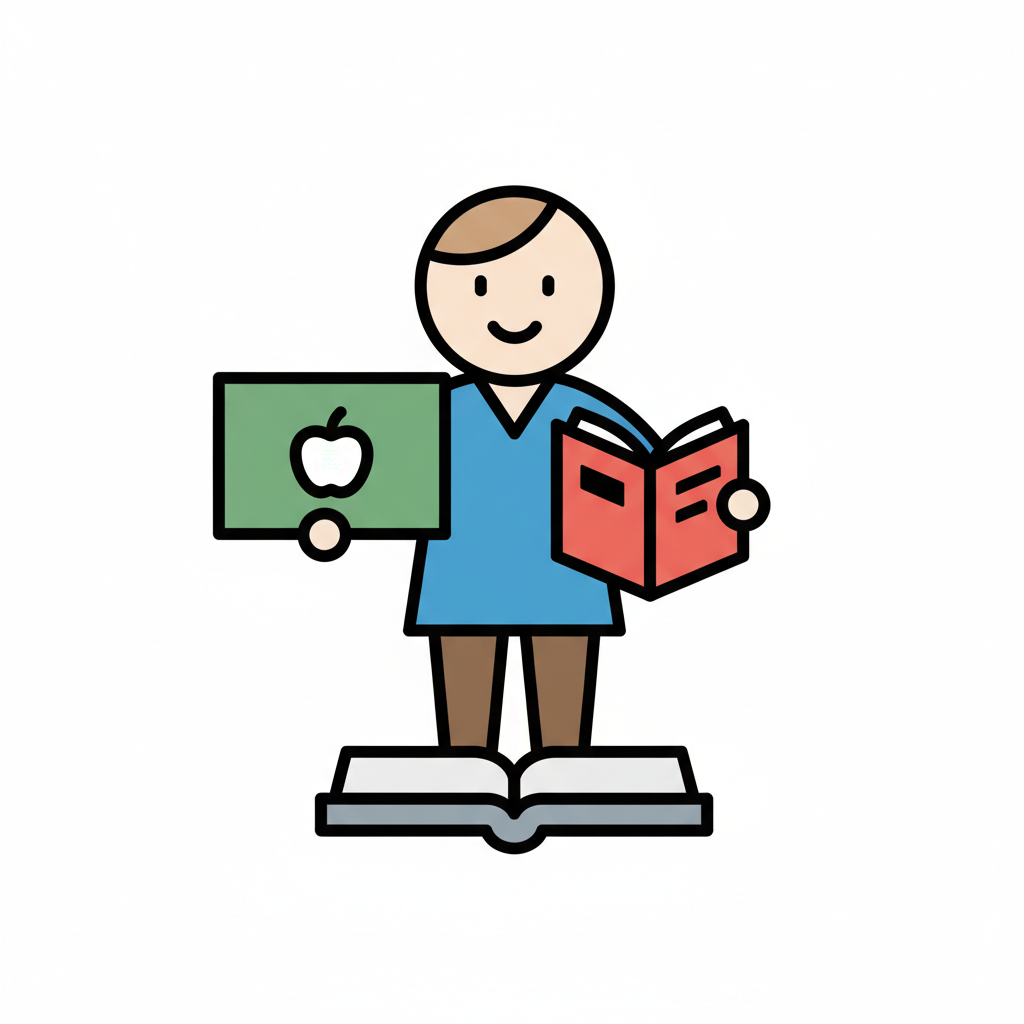 Stilisierte Figur mit Apfel-Tafel und Buch, stehend auf einem Buch, symbolisiert Bildung.