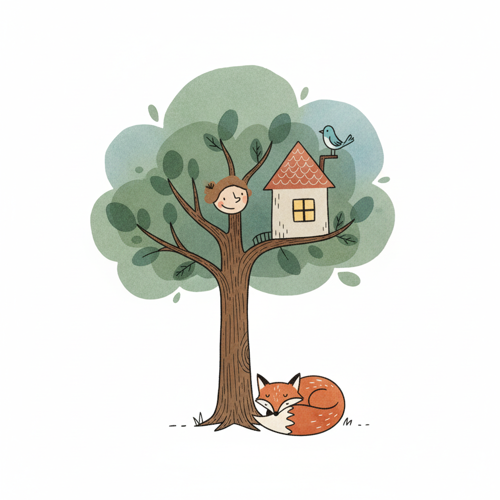 Niedliche Illustration: Fuchs schläft unter Baum mit Haus, Kind und Vogel in den Ästen.