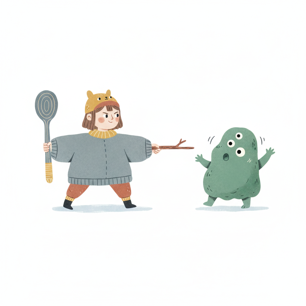 Mädchen mit Löffel und Stock konfrontiert ein verängstigtes grünes Monster.