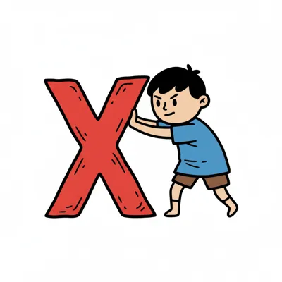 Cartoon-Junge schiebt einen großen roten Buchstaben X auf weißem Hintergrund.