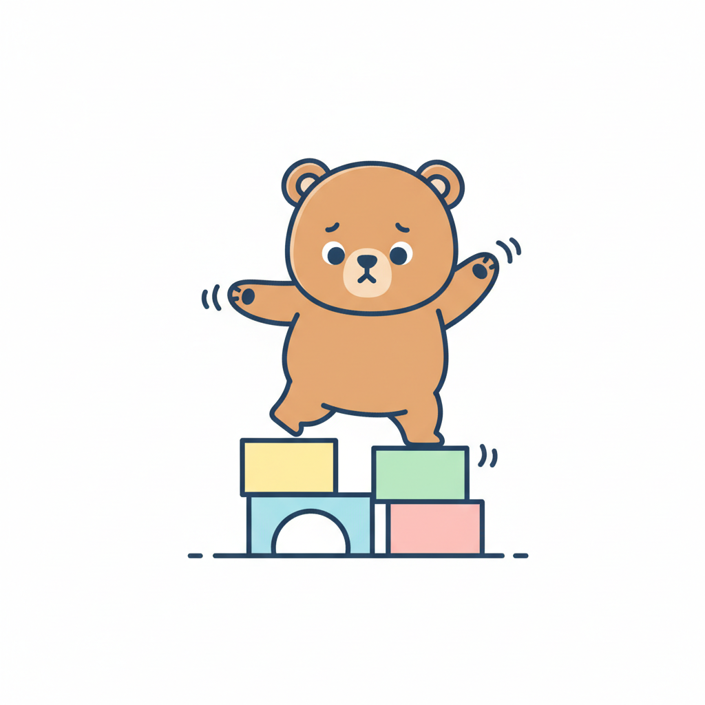 Ein süßer Cartoon-Bär balanciert vorsichtig auf bunten Bauklötzen und sieht besorgt aus.