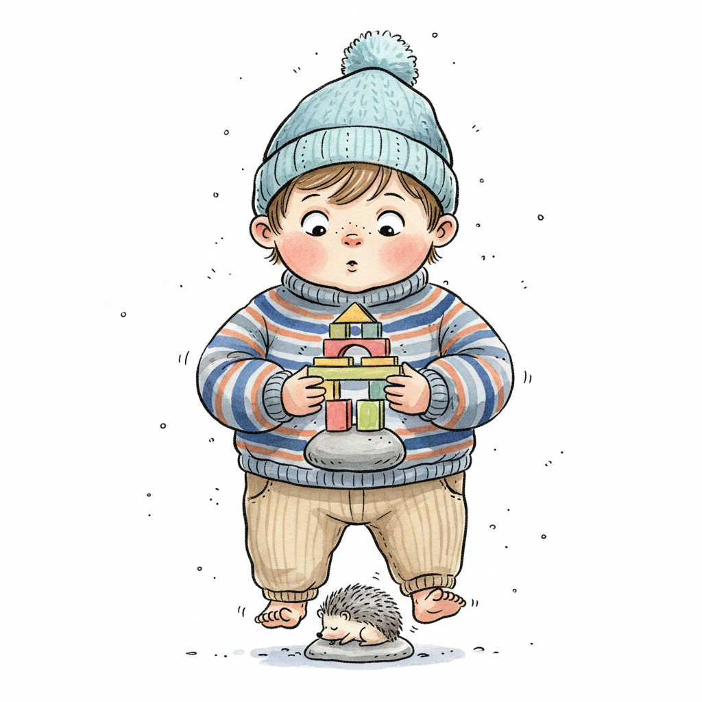 Niedliches Baby in Mütze und Pullover hält Bauklötze, ein Igel schläft zu seinen Füßen.