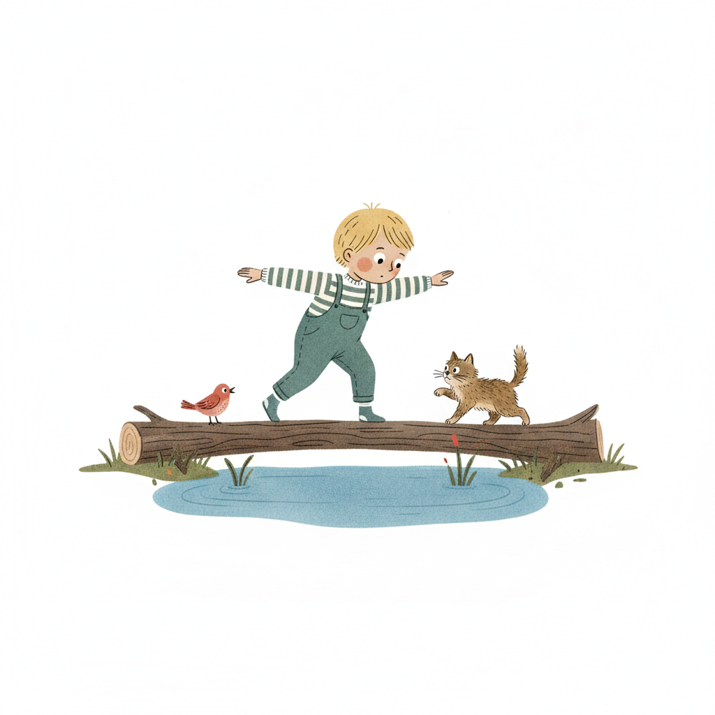 Ein Kind balanciert auf einem Baumstamm über Wasser, begleitet von Katze und Vogel.
