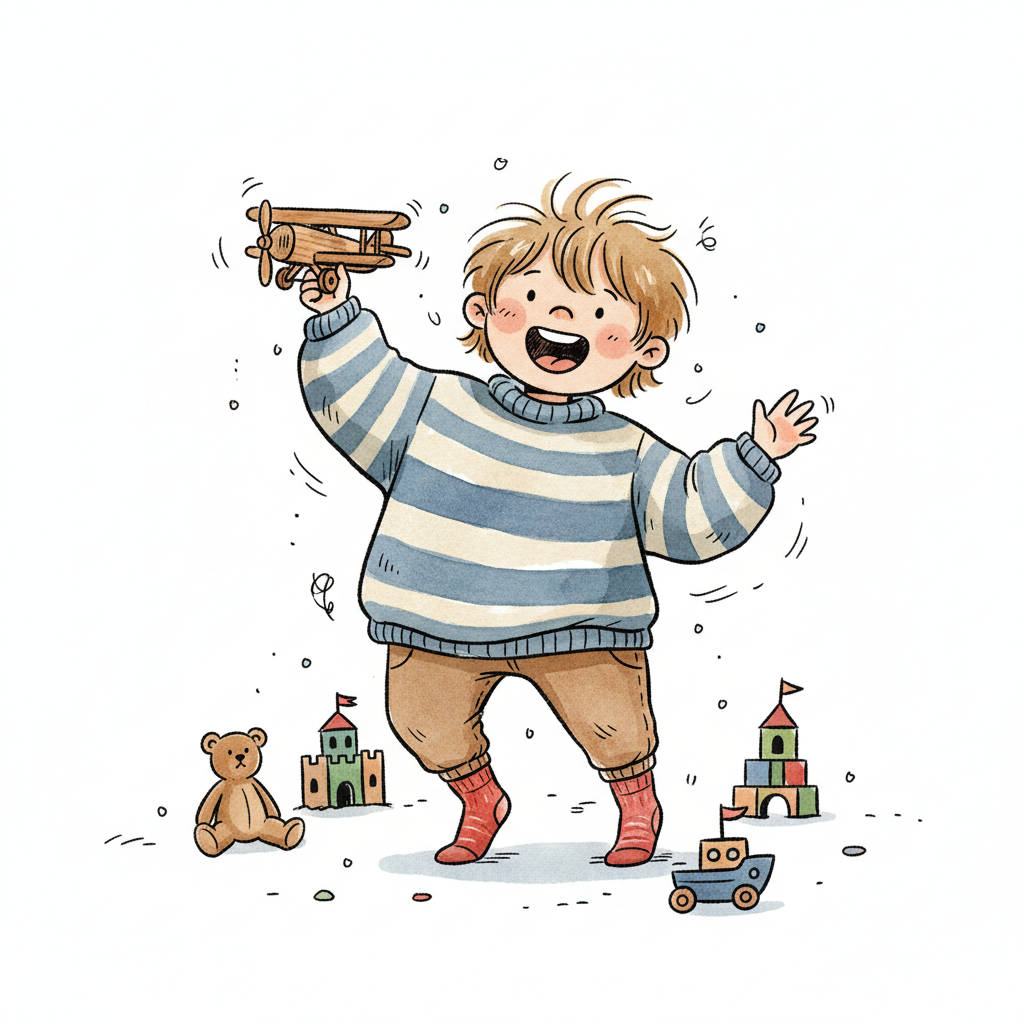 Glückliches Kind spielt mit Holzflugzeug, umgeben von Spielzeug wie Bären und Burgen.