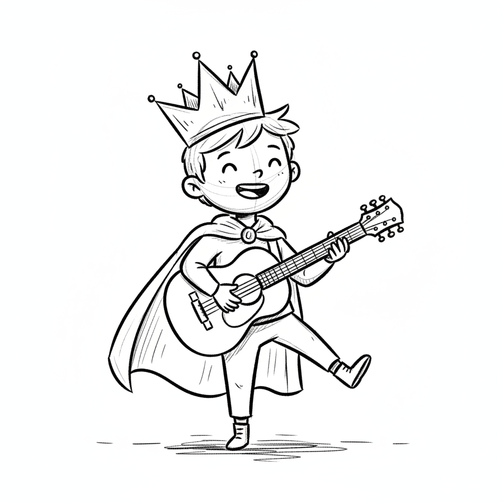 Glücklicher Cartoon-Junge als Prinz mit Krone und Umhang spielt Gitarre. Schwarz-Weiß-Strichzeichnung.