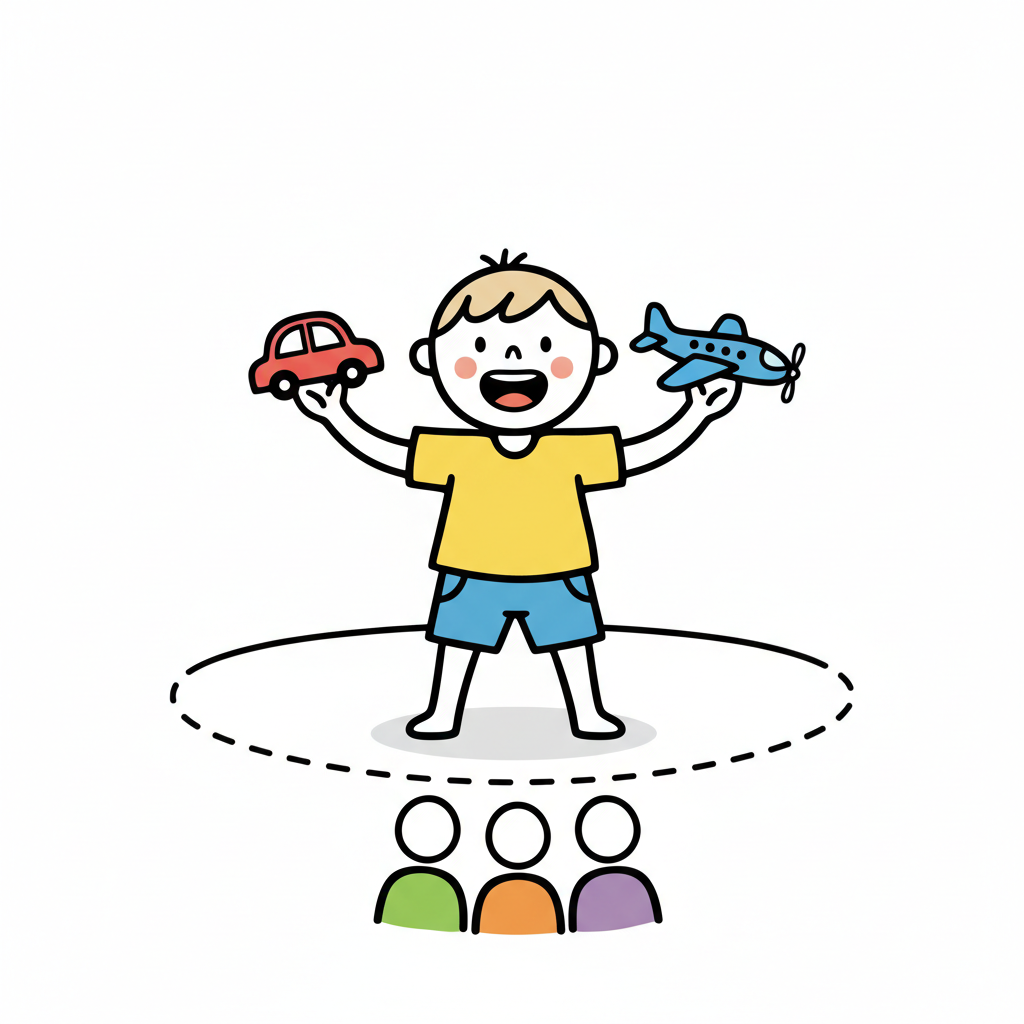 Glücklicher Junge zeigt Spielzeugauto und Flugzeug vor Publikum in einem Kreis.