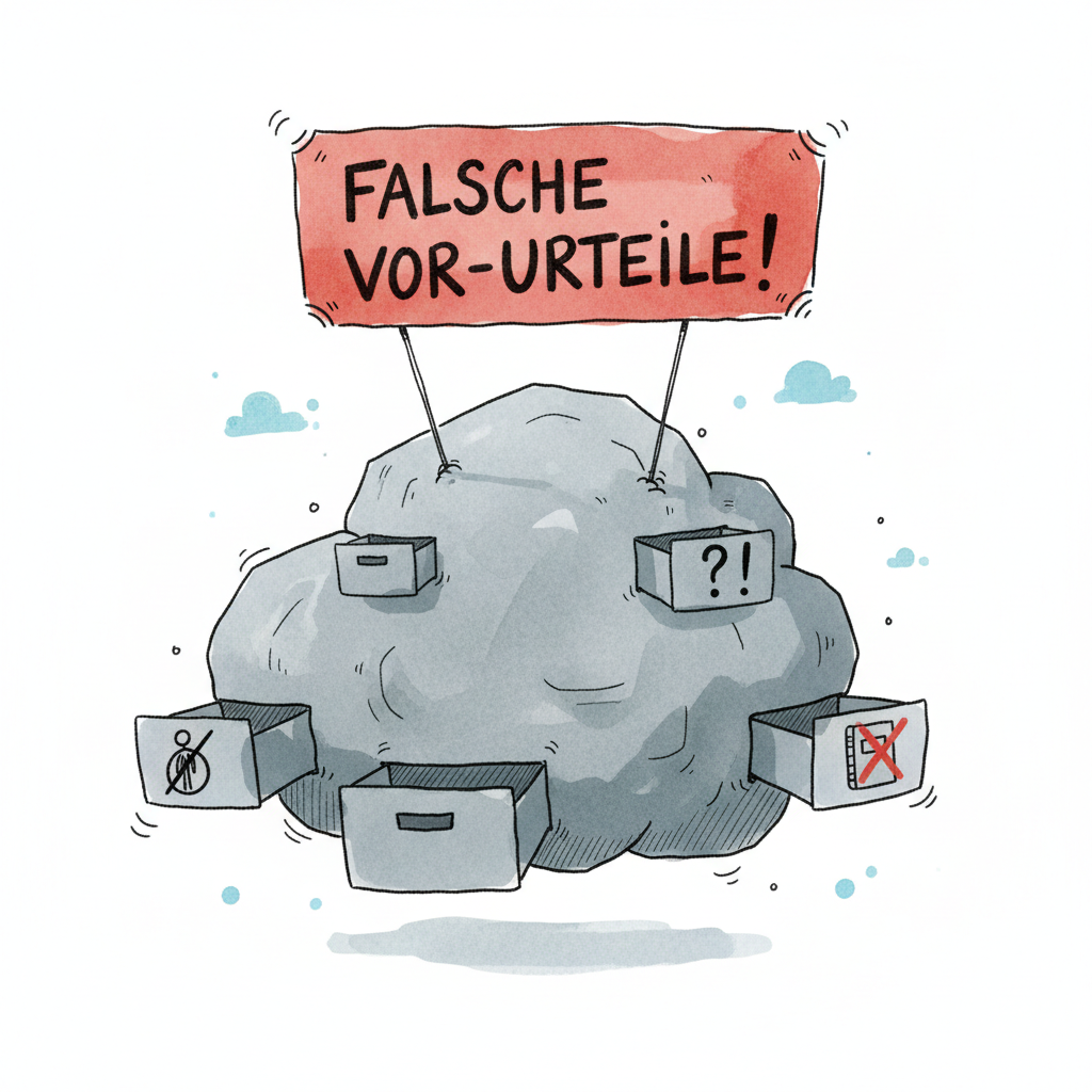 Schwebende Wolke mit "Falsche Vor-Urteile" und Schubladen voller negativer Symbole.