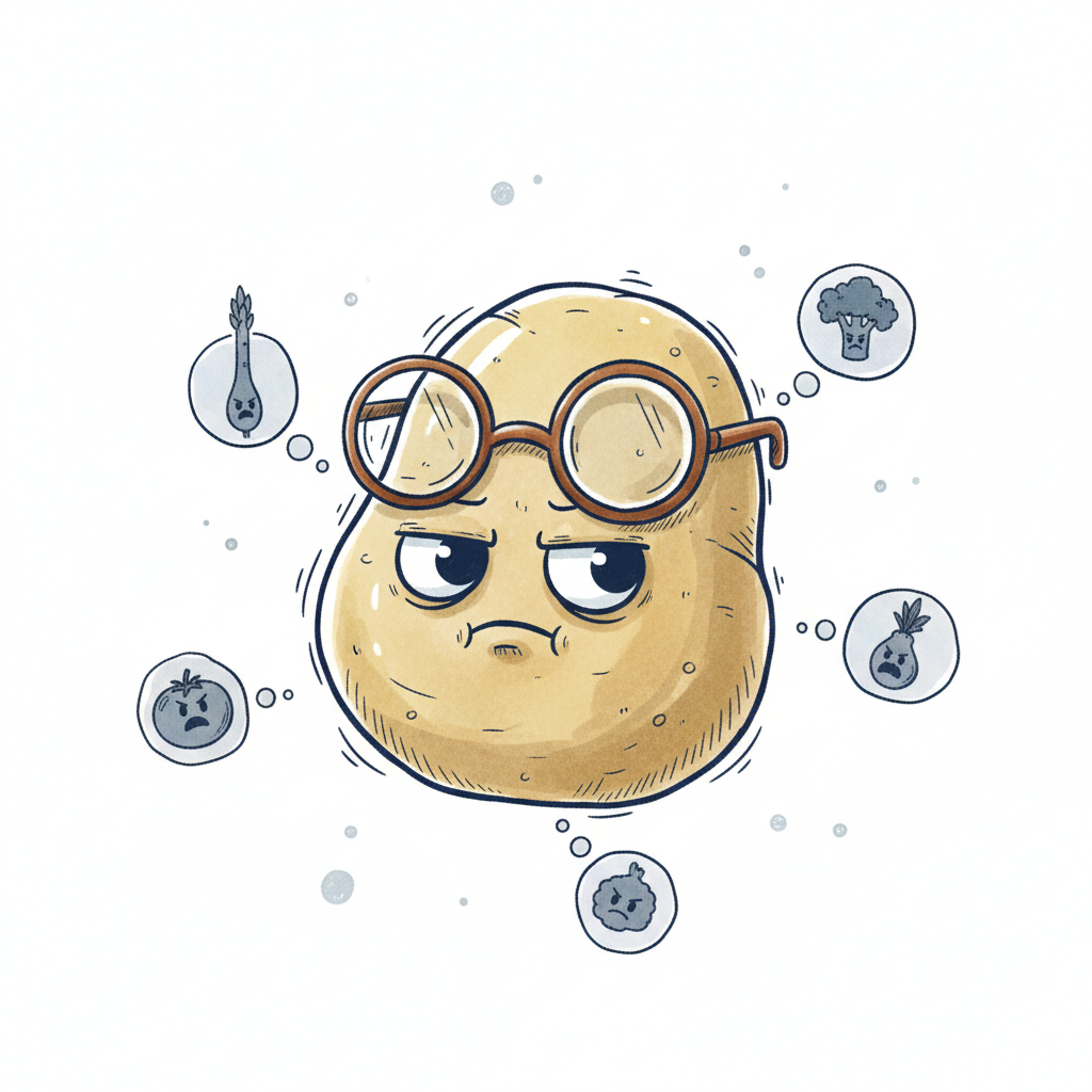 Eine mürrische Kartoffel mit Brille, umgeben von traurigen Gemüse-Gedankenblasen.