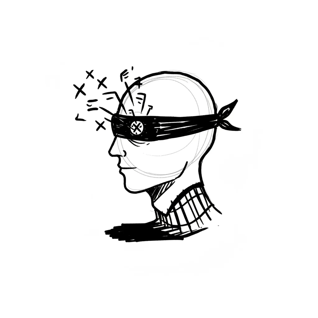 Skizze eines blind verbundenen Kopfes, aus dessen Stirn verwirrende Symbole strömen.