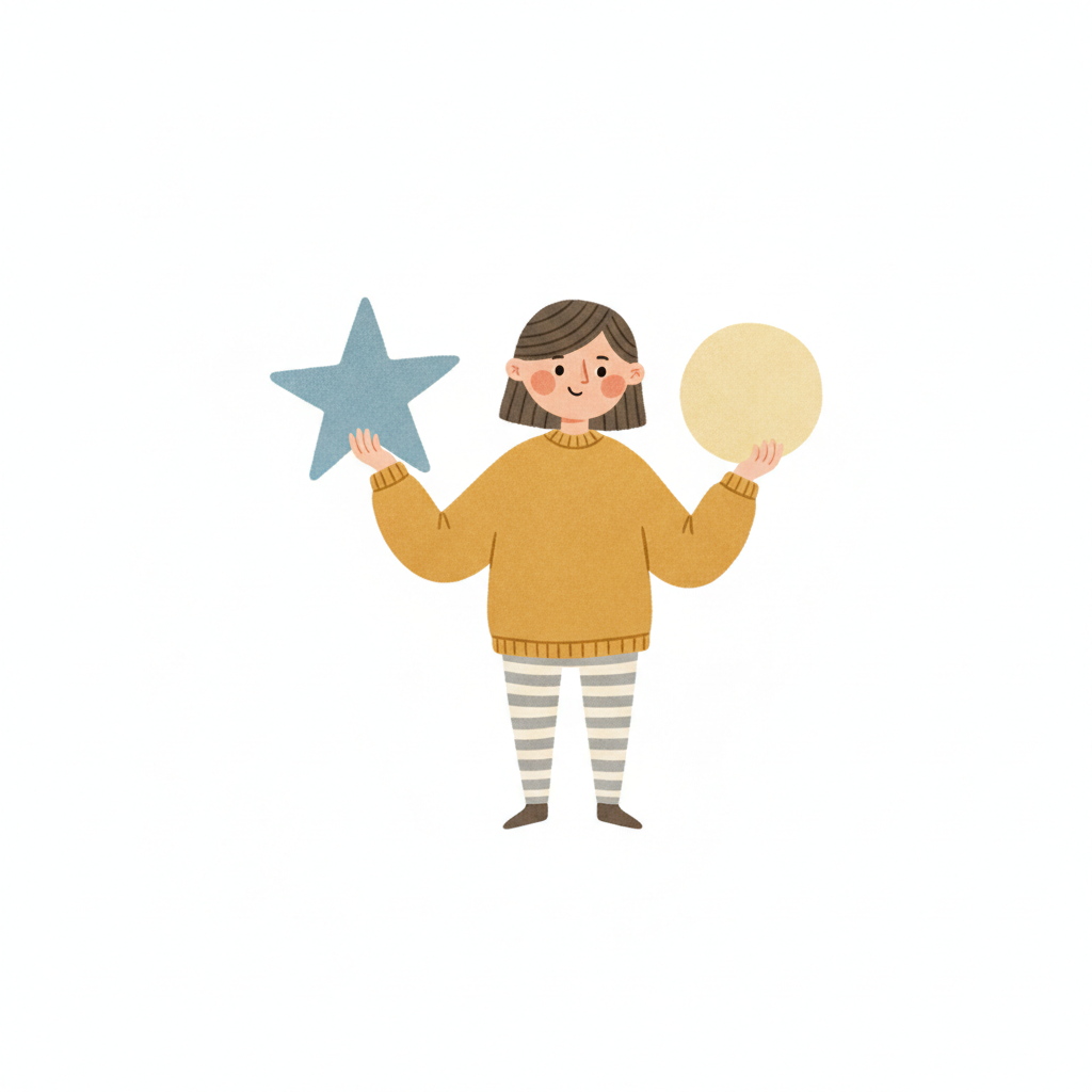 Niedliches Cartoon-Mädchen hält einen blauen Stern und einen gelben Kreis in den Händen.