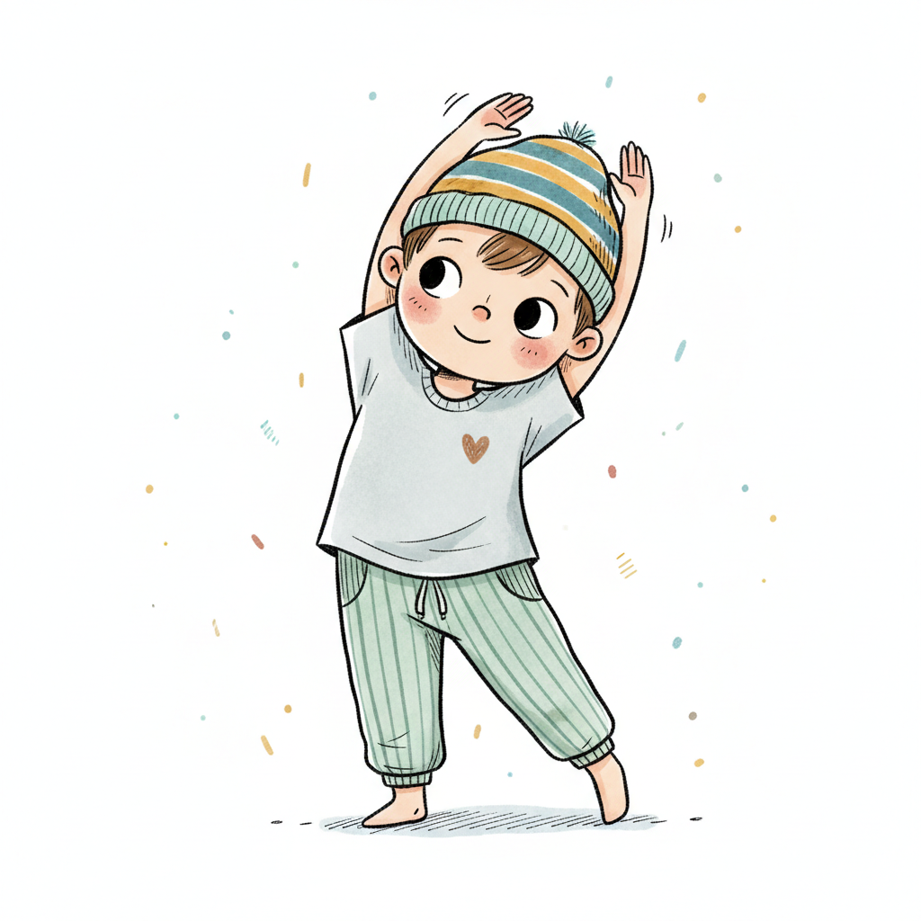 Niedliches Cartoon-Kind in Mütze und Pyjama streckt sich fröhlich mit erhobenen Armen.