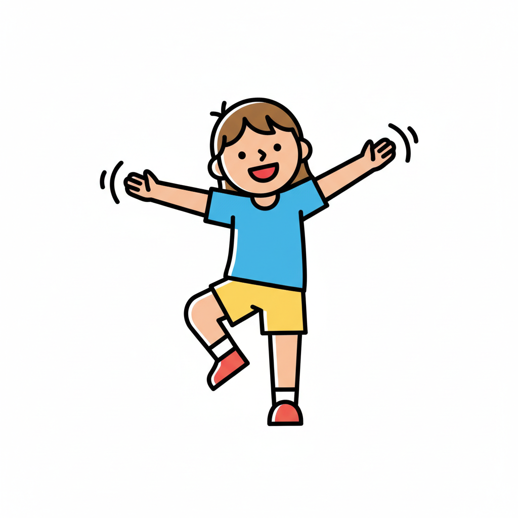 Fröhliches Cartoon-Mädchen balanciert auf einem Bein mit ausgestreckten Armen und lacht.