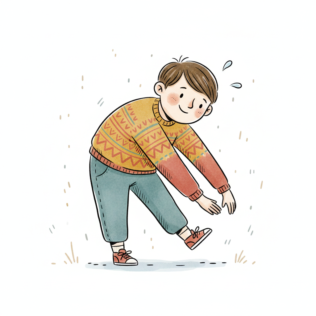 Cartoonjunge in Pullover beugt sich vor, lächelt und schwitzt leicht.