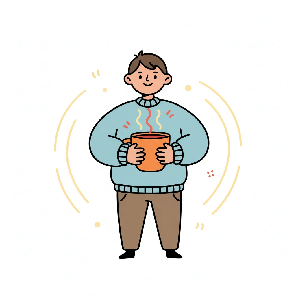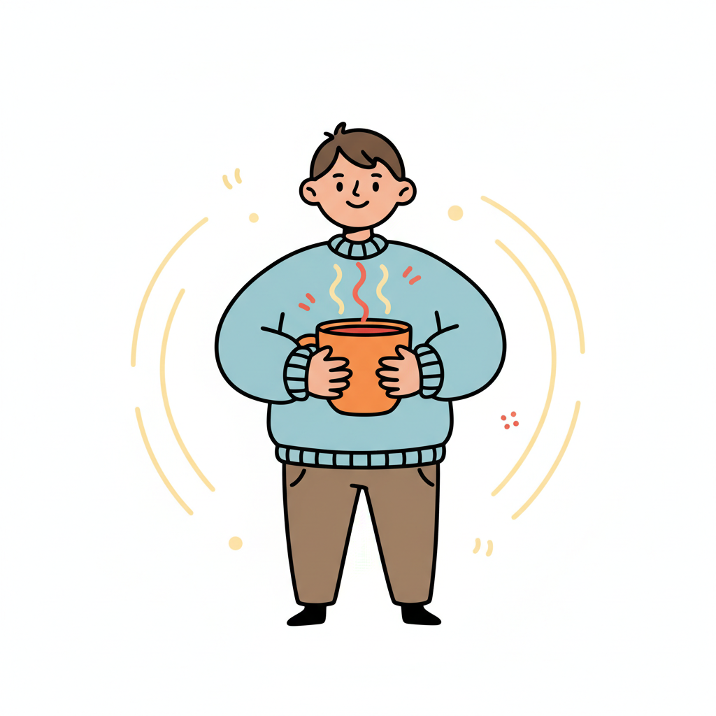Lächelnde Cartoonfigur in blauem Pullover hält eine dampfende Tasse.