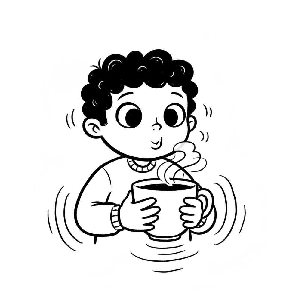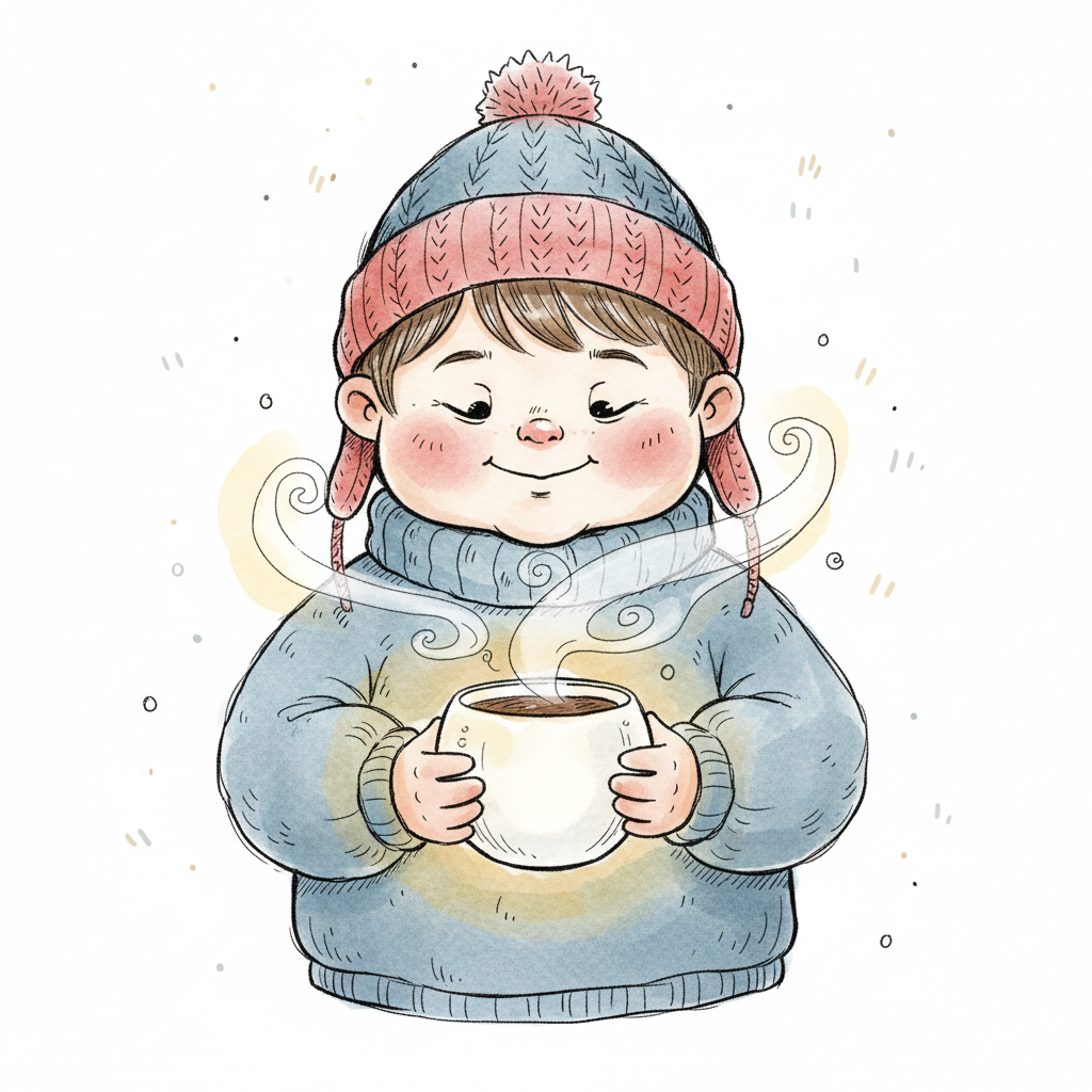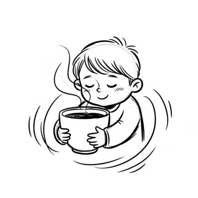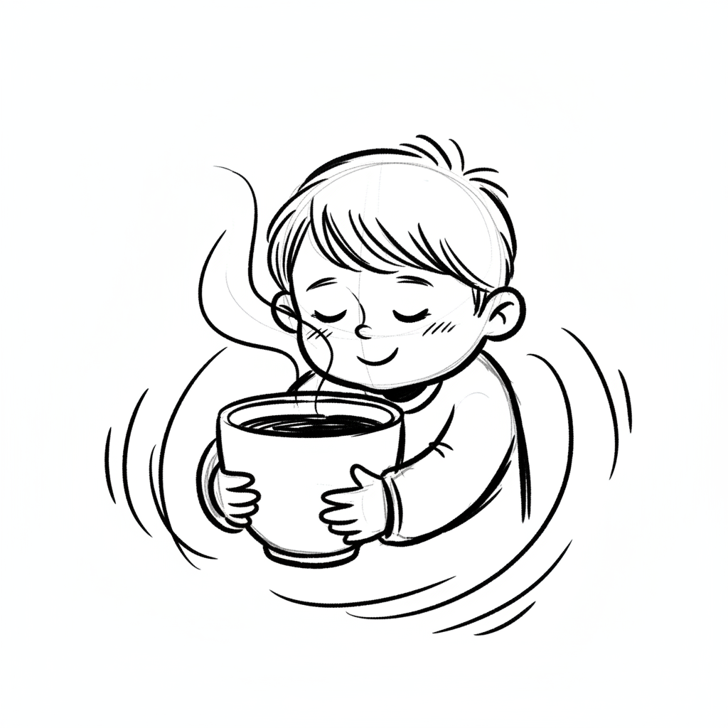 Cartoon-Kind hält dampfende Tasse, Augen geschlossen, genießt den Moment der Wärme.
