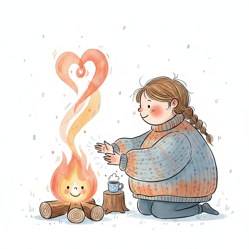 Niedliches Mädchen wärmt sich an einem lächelnden Lagerfeuer, dessen Rauch ein Herz bildet.