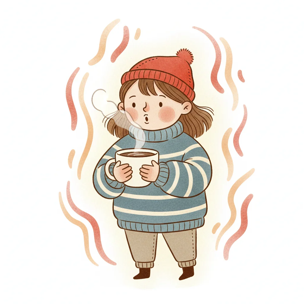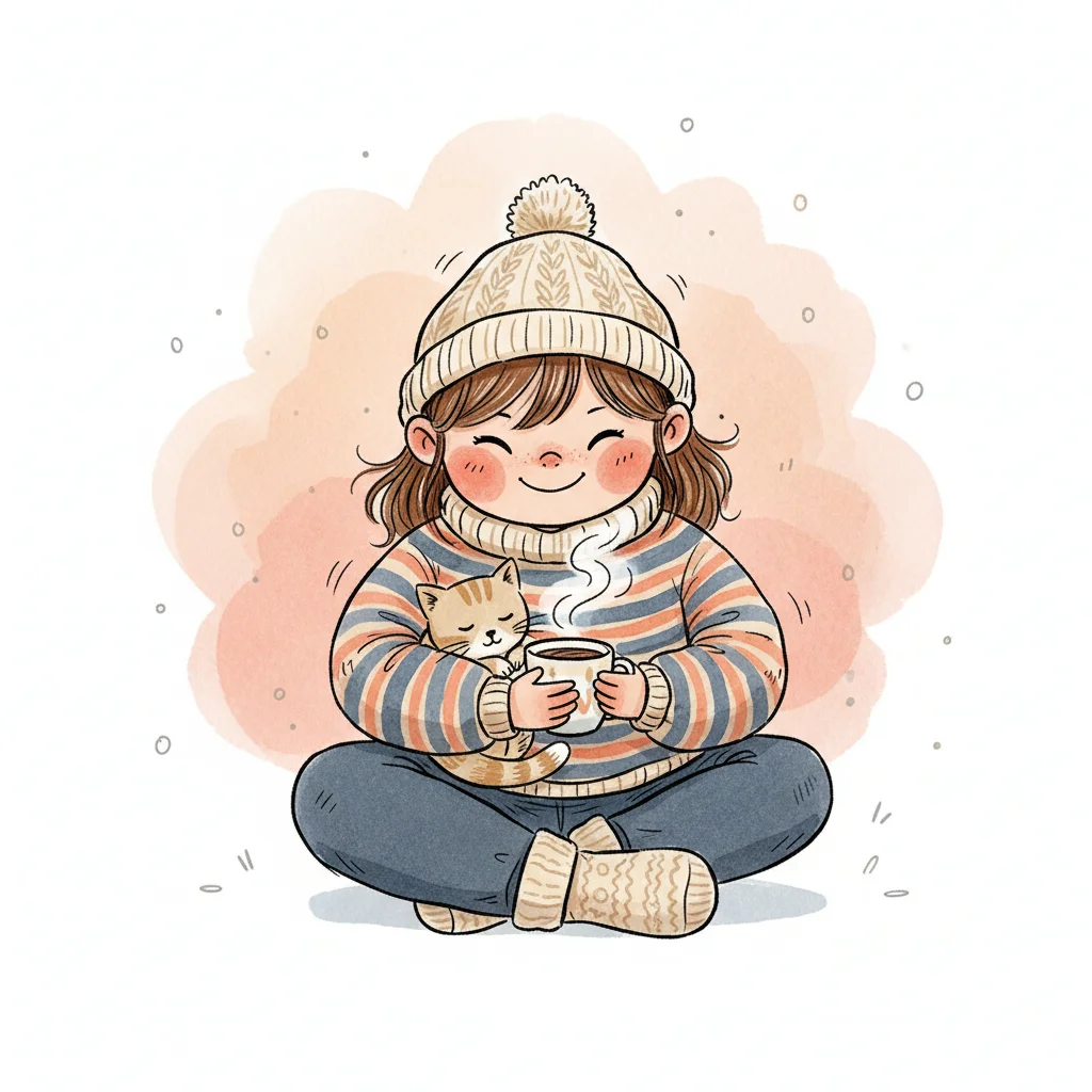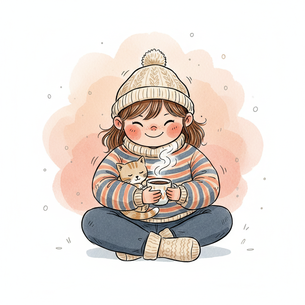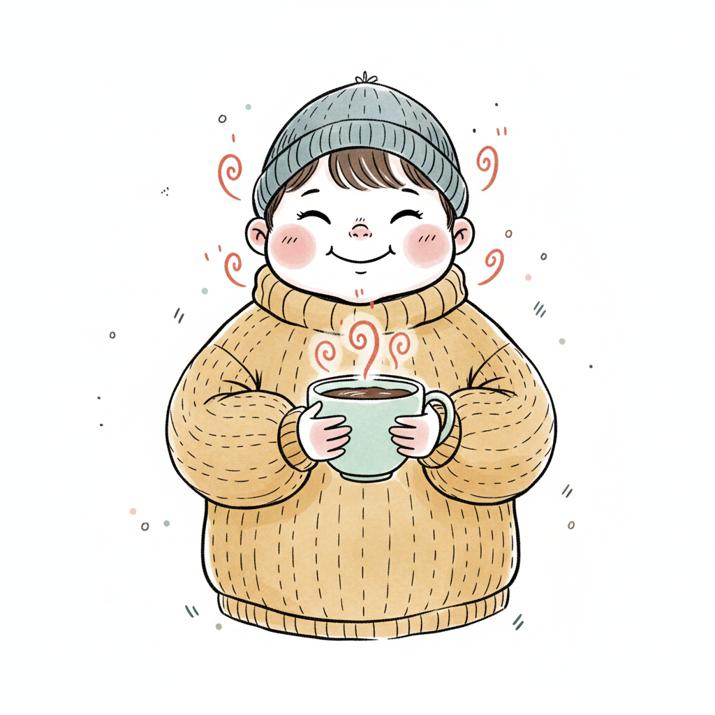 Niedliches Cartoon-Mädchen in Winterkleidung hält eine dampfende Tasse, umgeben von Wärme.