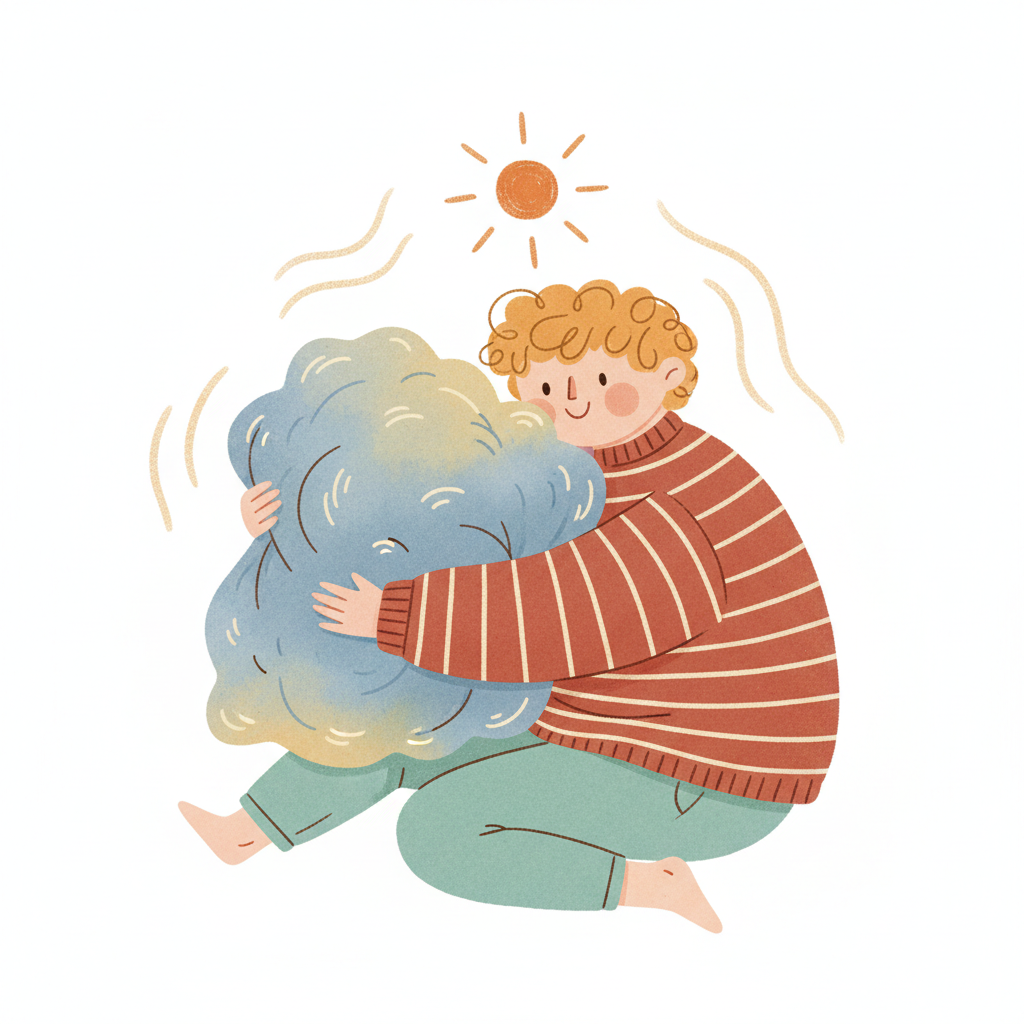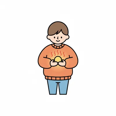 Lachende Cartoon-Figur in orangefarbenem Pullover hält einen warmen, leuchtenden Ball.