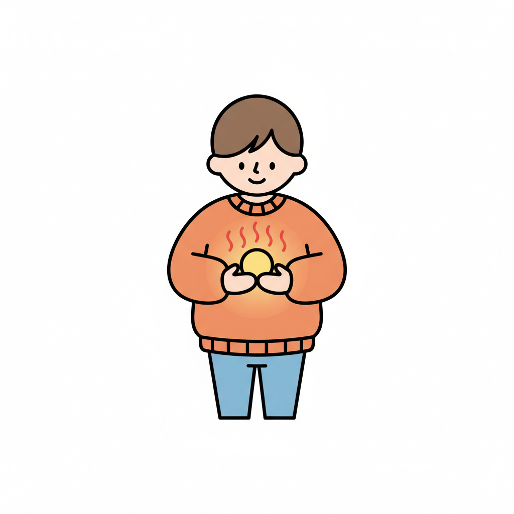Zeichnung einer Person, die ihr Herz hält, aus dem rote, wärmende Wellen strahlen.