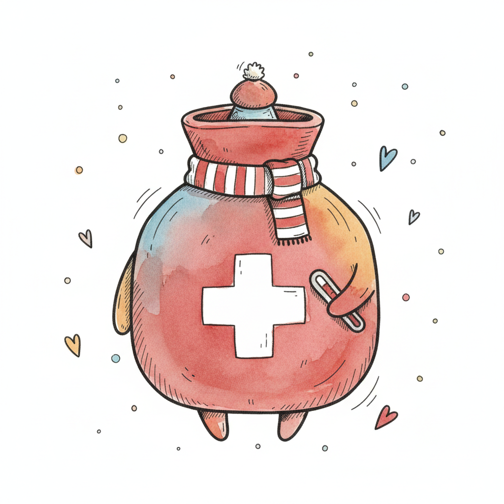 Niedliche Wärmflasche mit Mütze, Schal, rotem Kreuz und Thermometer im Aquarellstil.
