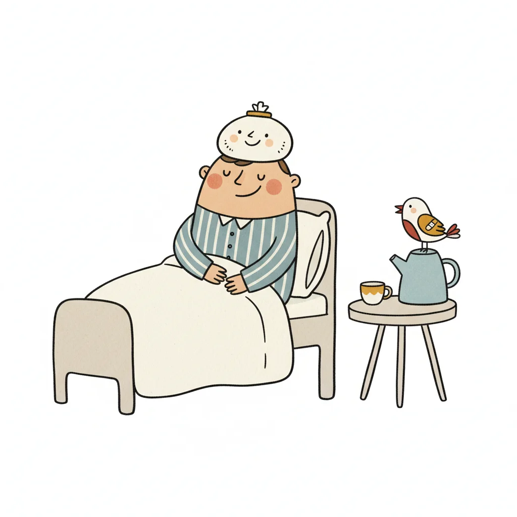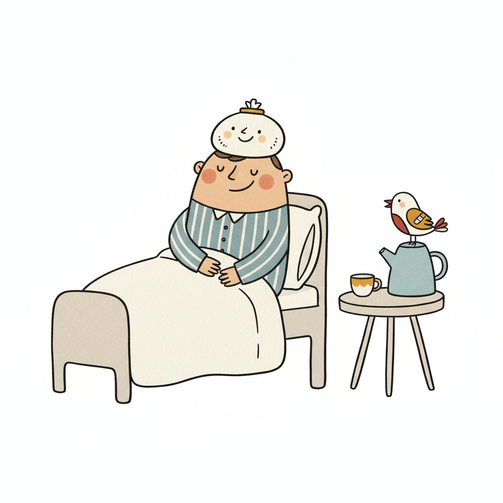 Kranker Mann im Bett mit Wärmflasche auf dem Kopf, daneben Teekanne mit Vogel und Tasse.