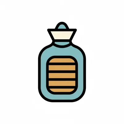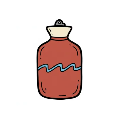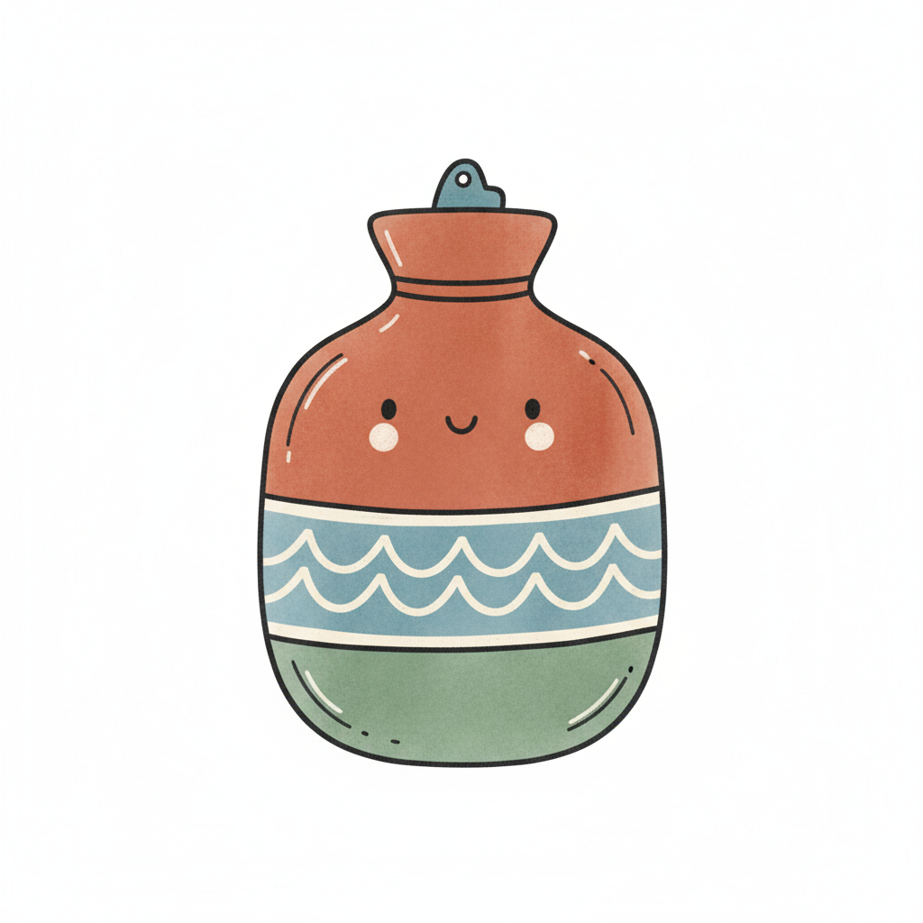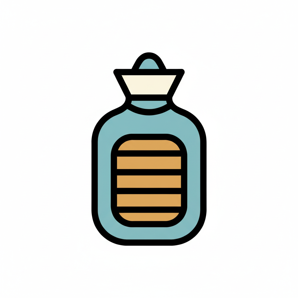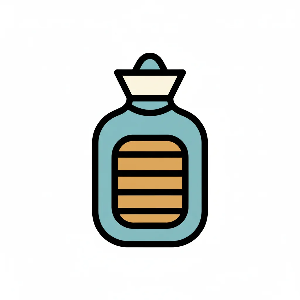 Stilisierte blaue Wärmflasche mit orangefarbenen Streifen und schwarzem Umriss auf weißem Hintergrund.