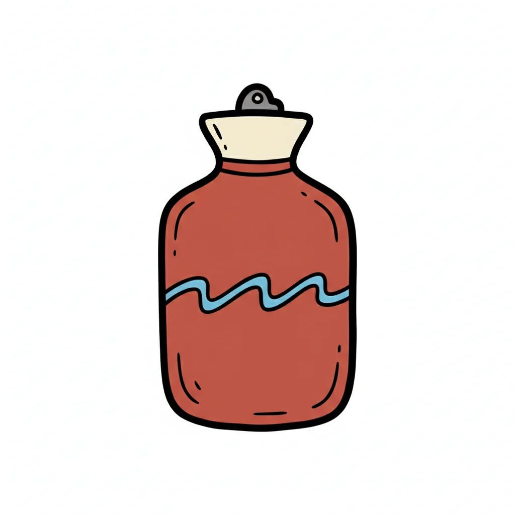 Illustrierte rote Wärmflasche mit blauer Wellenlinie und hellem Verschluss auf weißem Hintergrund.