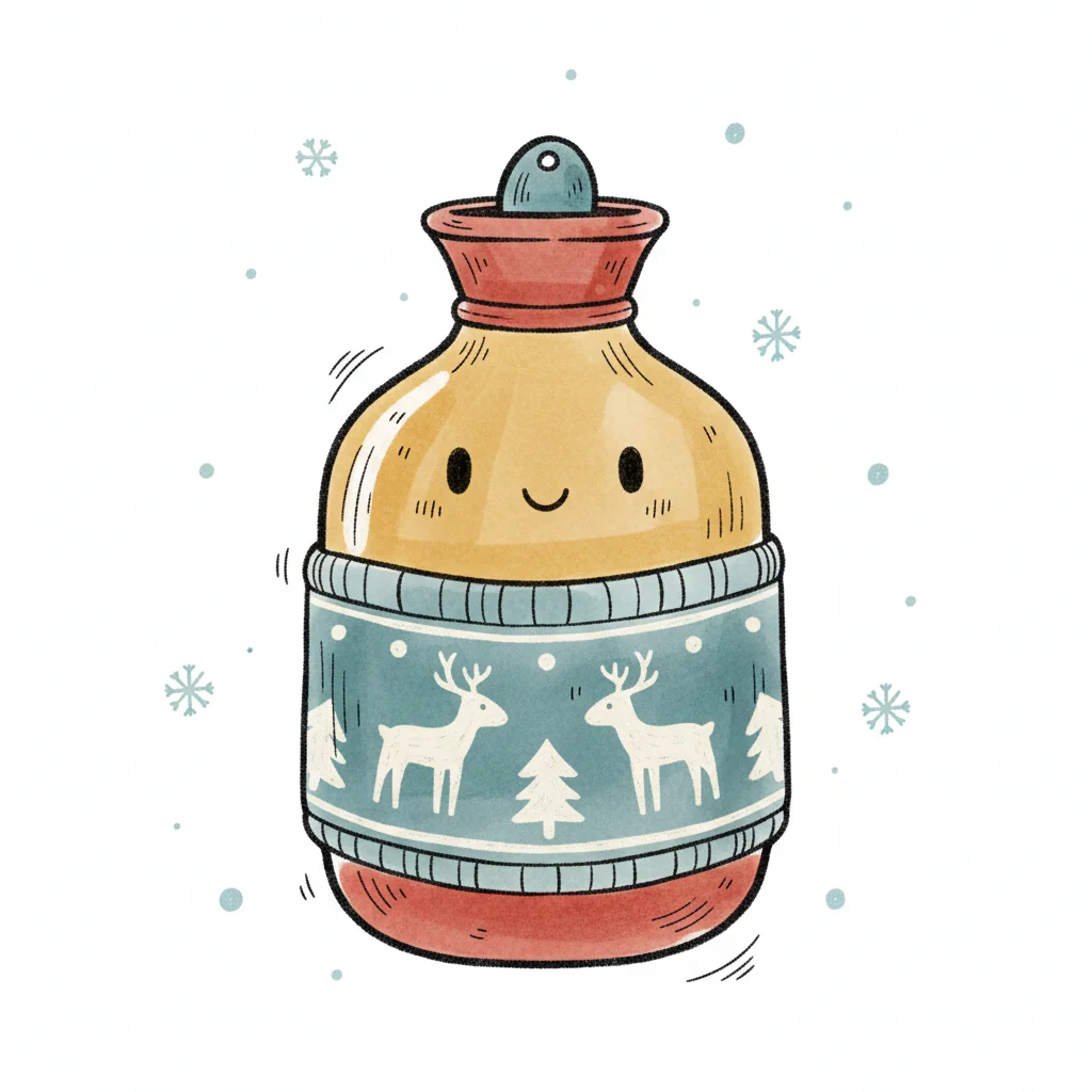 Niedliche Wärmflasche mit lächelndem Gesicht und winterlichem Rentier-Pullover, umgeben von Schneeflocken.