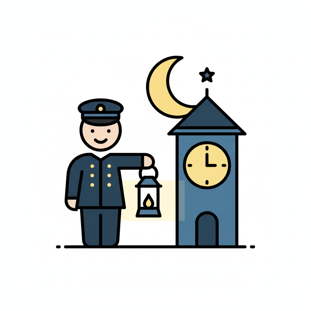 Mann in Uniform mit Laterne vor Uhrturm mit Halbmond und Stern, symbolisiert Nachtwache oder Ramadan.
