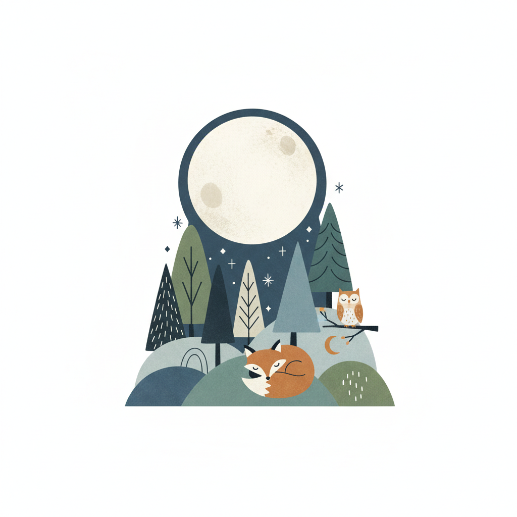 Mondnacht im Wald: Schlafender Fuchs, wache Eule unter großem Mond und Sternen.
