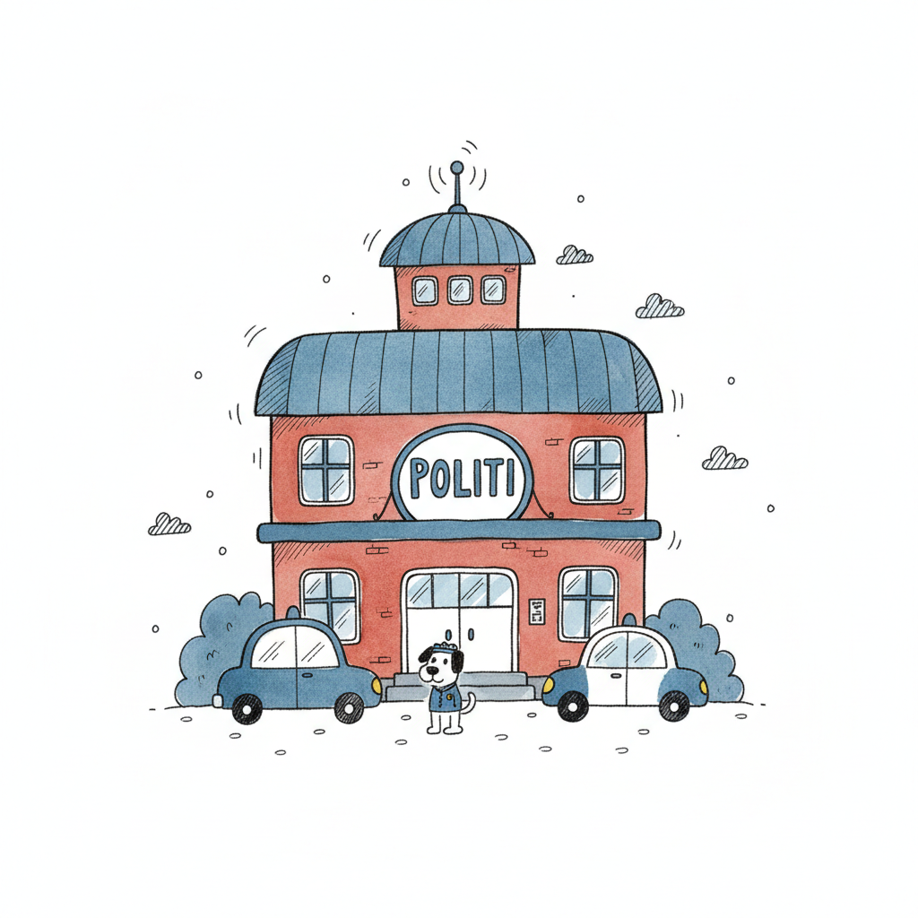 Niedliche Cartoon-Polizeistation mit "POLITI"-Schild, zwei Autos und einem Polizisten-Hund.