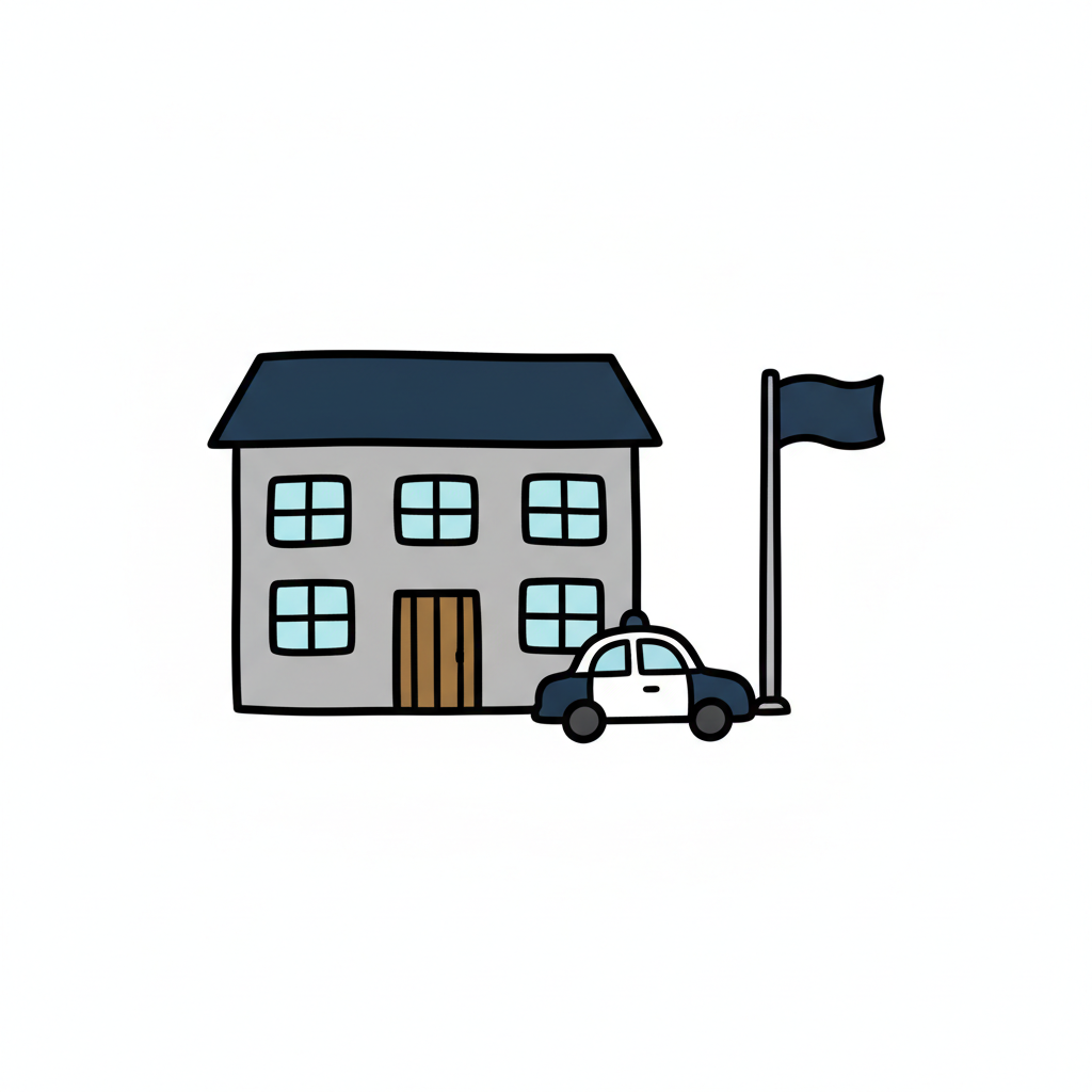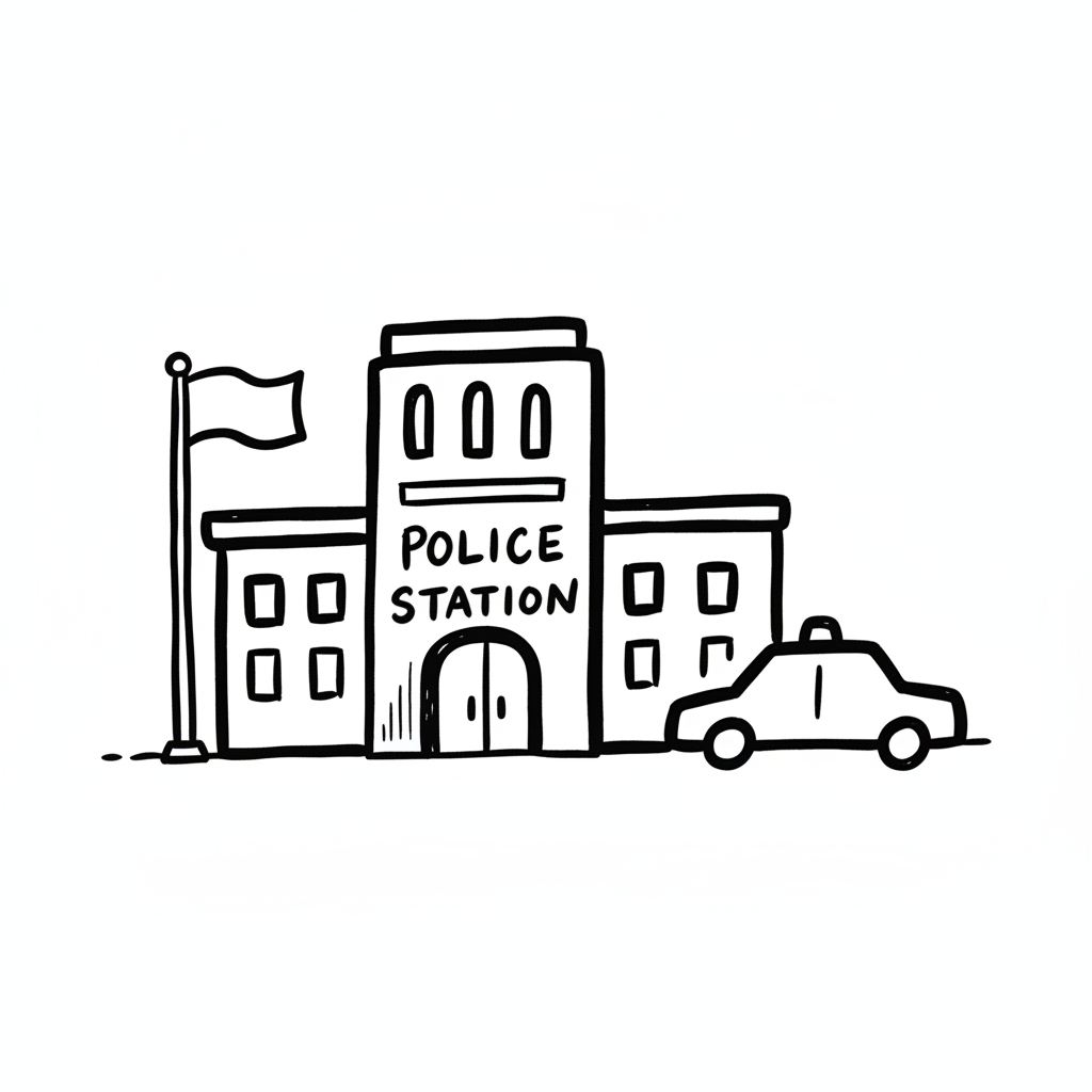 Handgezeichnete Skizze einer Polizeistation mit Polizeiauto und Flagge.