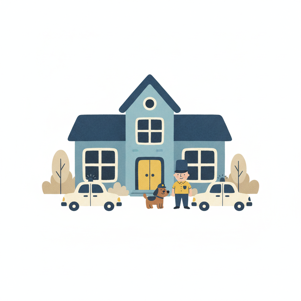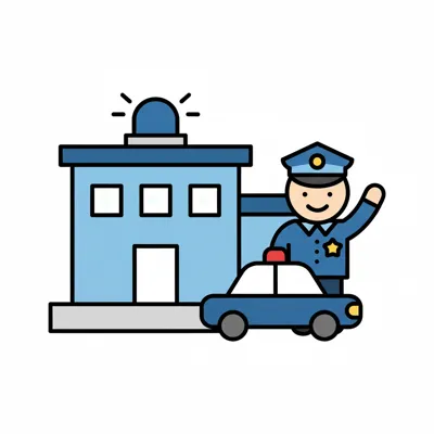 Stilisierte Darstellung einer Polizeistation mit Streifenwagen und Flagge.