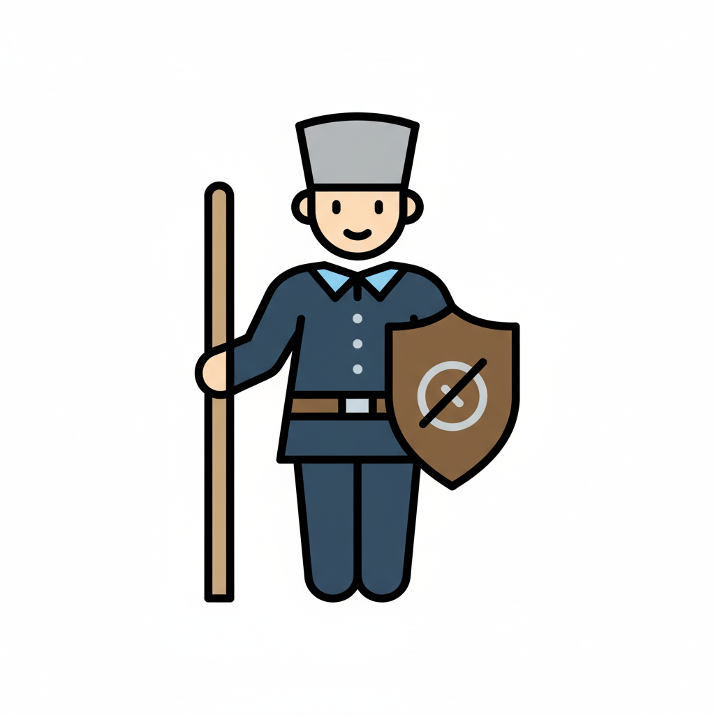 Wächter-Icon in Uniform mit Schild (Blockiersymbol) und Stab.