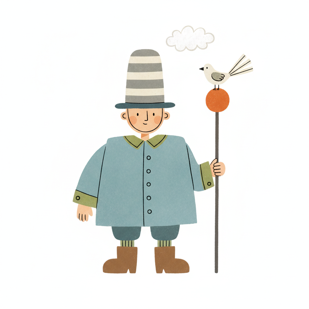 Stilisierte Figur mit gestreiftem Hut, blauem Mantel, Stock und Vogel auf der Spitze.